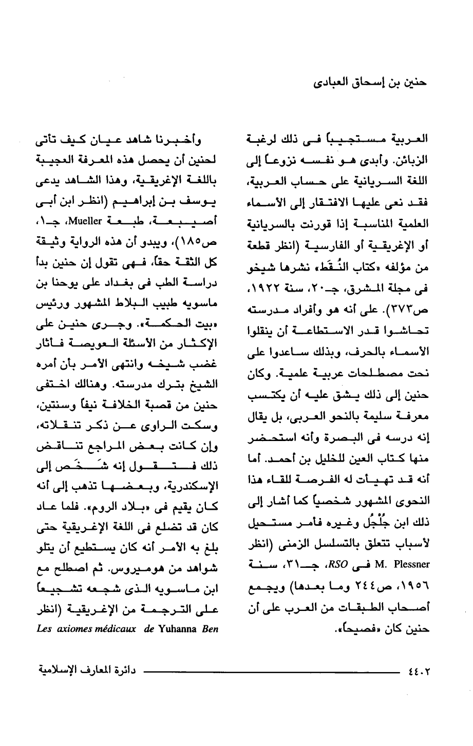 العربية مستجيبًا في ذلك لرغبة الزبائن. وأبدى هو نفسه نزوعًا إلى اللغة السريانية على حساب العربية، فقد نعى عليها الافتقار إلى الأسماء العلمية المناسبة إذا قورنت بالسريانية أو الإغريقية أو الفارسية (انظر قطعة من مؤلفه "كتاب النُقَط" نشرها شيخو في مجلة المشرق، جـ 20، سنة 1922، ص 373). على أنه هو وأفراد مدرسته تحاشوا قدر الاستطاعة أن ينقلوا الأسماء بالحرف، وبذلك ساعدوا على نحت مصطلحات عربية علمية. وكان حنين إلى ذلك يشق عليه أن يكتسب معرفة سليمة بالنحو العربي، بل يقال إنه درسه في البصرة وأنه استحضر منها كتاب العين للخليل بن أحمد. أما أنه قد تهيأت له الفرصة للقاء هذا النحوي المشهور شخصيًا كما أشار إلى ذلك ابن جُلْجُل وغيره فأمر مستحيل لأسباب تتعلق بالتسلسل الزمنى (انظر M. Plessner في rso، جـ 31، سنة 1956، ص 244 وما بعدها) ويجمع أصحاب الطبقات من العرب على أن حنين كان "فصيحًا".