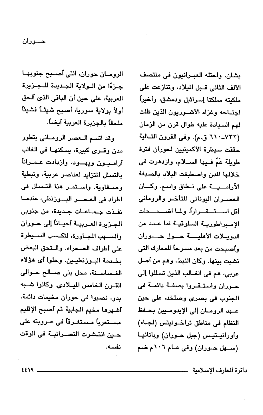 بشان. واحتله العبرانيون في منتصف الألف الثاني قبل الميلاد، وتنازعت على ملكيته مملكتا إسرائيل ودمشق، وأخيرًا اجتاحه وغزاه الأشوريون الذين ظلت لهم السيادة عليه طوال قرن من الزمان (732 - 610 ق. م). وفي القرون التالية حققت سيطرة الأكمينيين لحوران فترة طويلة عَمّ فيها السلام، وازدهرت في خلالها المدن واصطبغت البلاد بالصبغة الآرامية على نطاق واسع. وكان العصران اليوناني المتأخر والرومانى أقل استقرارًا. ولما اضمحلت الإمبراطورية السلوقية نما عدد من الدويلات الأهلية حول حوران وأصبحت من بعد مسرحًا للمعارك التي نشبت بينها. وكان النبط، وهم من أصل عربي، هم في الغالب الذين تسللوا إلى حوران واستقروا بصفة دائمة في الجنوب في بصرى وصلخد، على حين عهد الرومان إلى الإيدوميين بحفظ النظام في مناطق تراخونيتس (لجاء) وأورانيتيس (جبل حوران) وباتانيا (سهل حوران) وفي عام 106 م ضم الرومان حوران، التي أصبح جنوبها جزءًا من الولاية الجديدة للجزيرة العربية، على حين أن الباقى الذي ألحق أولًا بولاية سوريا، أصبح شيئًا فشيئًا ملحقًا بالجزيرة العربية أيضًا.