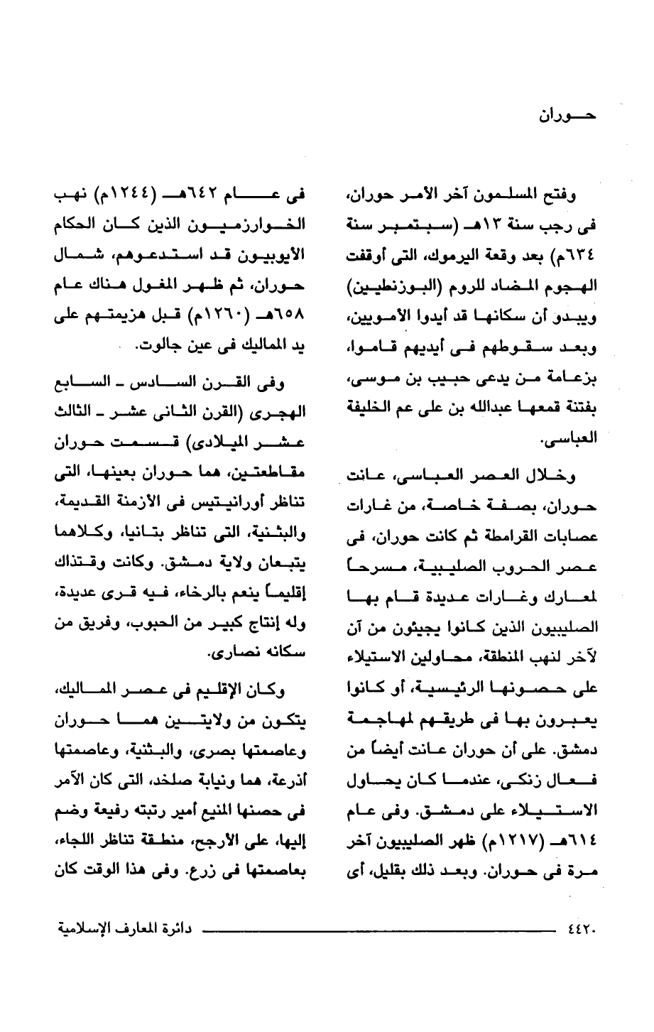 وفتح المسلمون آخر الأمر حوران، في رجب سنة 13 هـ (سبتمبر سنة 634 م) بعد وقعة اليرموك، التي أوقفت الهجوم المضاد للروم (البوزنطيين) ويبدو أن سكانها قد أيدوا الأمويين، وبعد سقوطهم في أيديهم قاموا، بزعامة من يدعى حبيب بن موسى، بفتنة قمعها عبد الله بن على عم الخليفة العباسى.
