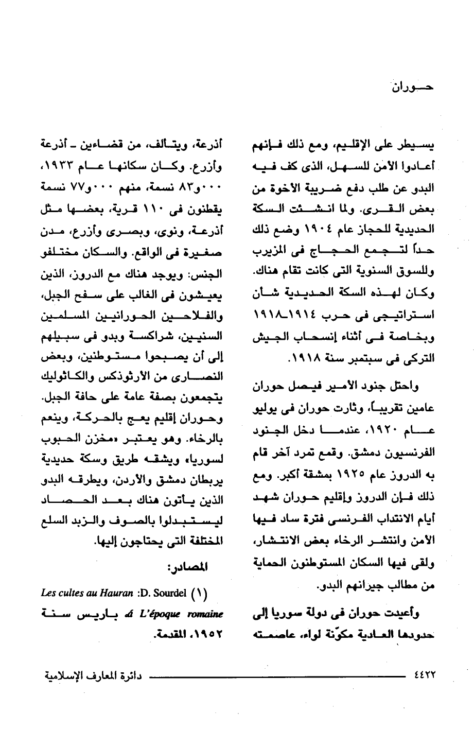 (1) Les cultes au Hauran: D. Sourdel L'epoque romaine باريس سنة 1952، المقدمة.