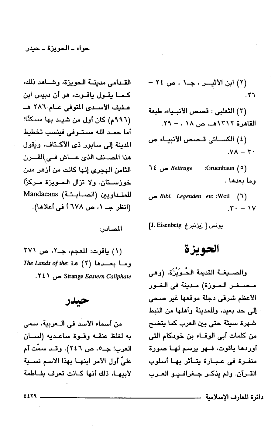والصيغة القديمة الحُوَيْزَة، (وهي مصغر الحوزة) مدينة في الخور الأعظم شرقى دجلة موقعها غير صحى إلى حد بعيد، وللمدينة وأهلها من النبط شهرة سيئة حتى بين العرب كما يتضح من كلمات أبي الوفاء بن خودكام التي أوردها ياقوت، فهو يرسم لها صورة منفرة في عبارة يتأثر بها أسلوب القرآن. ولم يذكر جغرافيو العرب القدامى مدينة الحويزة، وشاهد ذلك، كما يقول ياقوت، هو أن دبيس ابن عفيف الأسدى المتوفي عام 286 هـ (996 م) كان أول من شيد بها مسكنًا؛ أما حمد الله مستوفي فينسب تخطيط المدينة إلى سابور ذي الأكتاف، ويقول هذا المصنف الذي عاش في القرن الثامن الهجري أنها كانت من أزهر مدن خوزستان. ولا تزال الحويزة مركزًا للمنداويين (الصابئة) Mandaeans (انظر جـ 1، ص 678 أفي أعلاها).