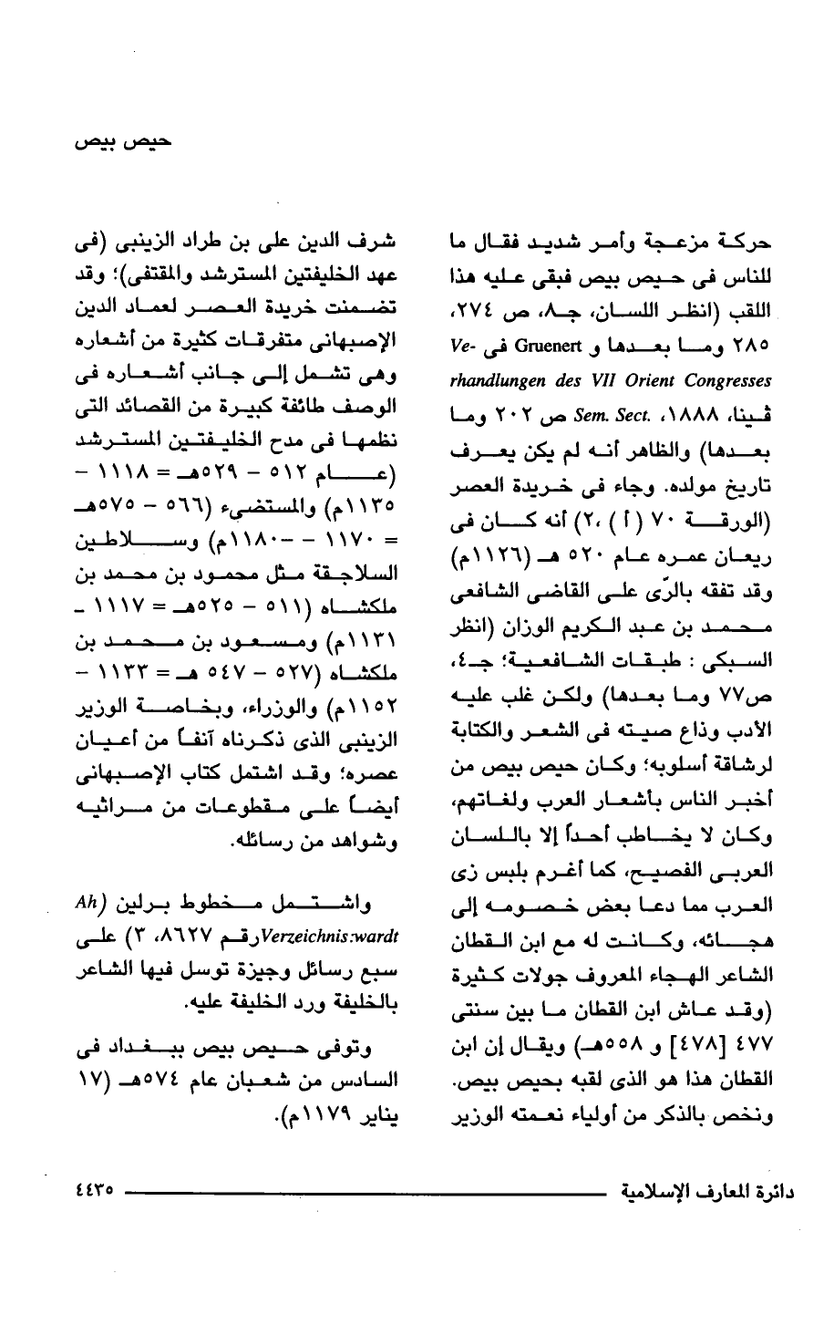 حركة مزعجة وأمر شديد فقال ما للناس في حيص بيص فبقى عليه هذا اللقب (انظر اللسان، جـ 8، ص 274, 285 وما بعدها و Gruenert في - Ve rhandlungen des VII Orient Congresses فينا، 1888 Sem. Sect. ص 202 وما بعدها) والظاهر أنه لم يكن يعرف تاريخ مولده. وجاء في خريدة العصر (الورقة 70 (أ)، 2) أنه كان في ريعان عمره عام 520 هـ (1126 م) وقد تفقه بالرى على القاضى الشافعى محمد بن عبد الكريم الوزان (انظر السبكى: طبقات الشافعية؛ جـ 4، ص 77 وما بعدها) ولكن غلب عليه الأدب وذاع صيته في الشعر والكتابة لرشاقة أسلوبه؛ وكان حيص بيص من أخبر الناس بأشعار العرب ولغاتهم، وكان لا يخاطب أحدًا إلا باللسان العربي الفصيح، كما أغرم بلبس زى العرب مما دعا بعض خصومه إلى هجائه، وكانت له مع ابن القطان الشاعر الهجاء المعروف جولات كثيرة (وقد عاش ابن القطان ما بين سنتى 477 [478] و 558 هـ) ويقال إن ابن القطان هذا هو الذي لقبه بحيص بيص. ونخص بالذكر من أولياء نعمته الوزير شرف الدين على بن طراد الزينبى (في عهد الخليفتين المسترشد والمقتفي)؛ وقد تضمنت خريدة العصر لعماد الدين الإصبهانى متفرقات كثيرة من أشعاره وهي تشمل إلى جانب أشعاره في الوصف طائفة كبيرة من القصائد التي نظمها في مدح الخليفتين المسترشد (عام 512 - 529 هـ = 1118 - 1135 م) والمستضيء (566 - 575 هـ = 1170 - 1180 م) وسلاطين السلاجقة مثل محمود بن محمد بن ملكشاه (511 - 525 هـ = 1117 - 1131 م) ومسعود بن محمد بن ملكشاه) (527 - 547 هـ = 1133 - 1152 م) والوزراء، وبخاصة الوزير الزينبى الذي ذكرناه آنفًا من أعيان عصره؛ وقد اشتمل كتاب الإصبهانى أيضًا على مقطوعات من مراثيه وشواهد من رسائله.