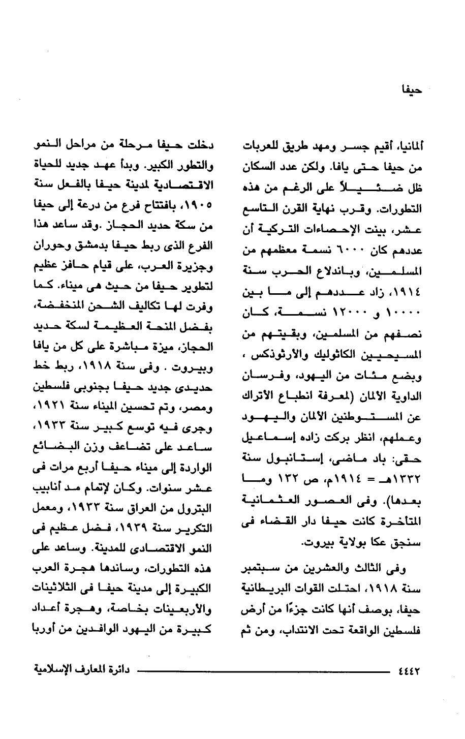 ألمانيا، أقيم جسر ومهد طريق للعربات من حيفا حتى يافا. ولكن عدد السكان ظل ضئيلًا على الرغم من هذه التطورات. وقرب نهاية القرن التاسع عشر، بينت الإحصاءات التركية أن عددهم كان 6000 نسمة معظمهم من المسلمين، وباندلاع الحرب سنة 1914، زاد عددهم إلى ما بين 10000 و 12000 نسمة، كان نصفهم من المسلمين، وبقيتهم من المسيحيين الكاثوليك والأرثوذكس، وبضع مئات من اليهود، وفرسان الداوية الألمان (لمعرفة انطباع الأتراك عن المستوطنين الألمان واليهود وعملهم، انظر بركت زاده إسماعيل حقى: باد ماضى، إستانبول سنة 1332 هـ = 1914 م، ص 132 وما بعدها). وفي العصور العثمانية المتأخرة كانت حيفا دار القضاء في سنجق عكا بولاية بيروت.