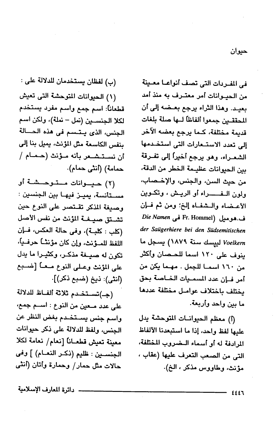 (أ) معظم الحيوانات المتوحشة يدل عليها لفظ واحد، إذا ما استبعدنا الألفاظ المرادفة له أو أسماء الضروب المختلفة، التي من الصعب التعرف عليها (عقاب، مؤنث، وطاووس مذكر، الخ).