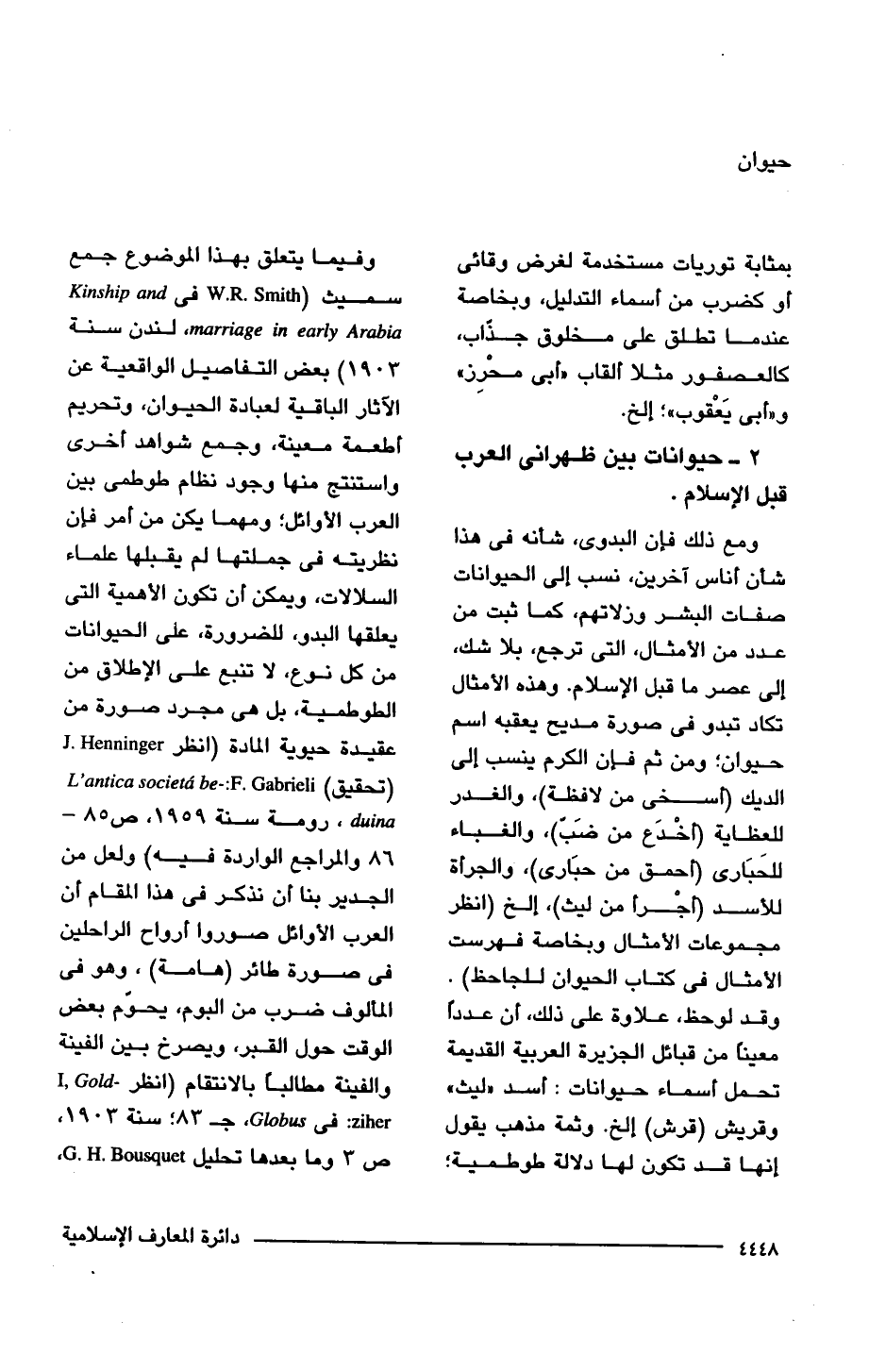ومع ذلك فإن البدوى، شأنه في هذا شأن أناس آخرين، نسب إلى الحيوانات صفات البشر وزلاتهم، كما ثبت من عدد من الأمثال، التي ترجع، بلا شك، إلى عصر ما قبل الإسلام. وهذه الأمثال تكاد تبدو في صورة مديح يعقبه اسم حيوان؛ ومن ثم فإن الكرم ينسب إلى الديك (أسخى من لافظة)، والغدر للعظاية (أخْدَع من ضبّ)، والغباء للحَبَارى (أحمق من حبَارى)، والجرأة للأسد (أجْرأ من ليث)، إلخ (انظر مجموعات الأمثال وبخاصة فهرست الأمثال في كتاب الحيوان للجاحظ). وقد لوحظ، علاوة على ذلك، أن عددًا معينًا من قبائل الجزيرة العربية القديمة تحمل أسماء حيوانات: أسد "ليث" وقريش (قرش) إلخ. وثمة مذهب يقول إنها قد تكون لها دلالة طوطمية؛ وفيما يتعلق بهذا الموضوع جمع سميث (W. R. Smith في، Kinship and marriage in early Arabia, لندن سنة 1903) بعض التفاصيل الواقعية عن الآثار الباقية لعبادة الحيوان، وتحريم أطعمة معينة، وجمع شواهد أخرى واستنتج منها وجود نظام طوطمى بين العرب الأوائل؛ ومهما يكن من أمر فإن نظريته في جملتها لم يقبلها علماء السلالات، ويمكن أن تكون الأهمية التي يعلقها البدو، للضرورة، على الحيوانات من كل نوع، لا تنبع على الإطلاق من الطوطمية، بل هي مجرد صورة من عقيدة حيوية المادة (انظر J. Henninger (تحقيق) L'antica society be-: F. Gabrieli duina، رومة سنة 1959، ص 85 - 86 والمراجع الواردة فيه) ولعل من الجدير بنا أن نذكر في هذا المقام أن العرب الأوائل صوروا أرواح الراحلين في صورة طائر (هامة)، وهو في المألوف ضرب من البوم، يحوّم بعض الوقت حول القبر، ويصرخ بين الفينة والفينة مطالبًا بالانتقام (انظر - I, Gold ziher في Globus، جـ 83؛ سنة 1903، ص 3 وما بعدها تحليل G. H. Bousquet،