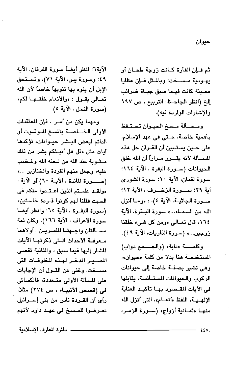 ومسألة مسخ الحيوان تحتفظ بأهمية خاصة، حتى في عهد الإسلام، على حين يستبين أن القرآن حل هذه المسألة لأنه يقرر مرارًا أن الله خلق الحيوانات (سورة البقرة، الآية 164؛ سورة لقمان، الآية 10؛ سورة الشورى آية 29؛ سورة الزخرف، الآية 12؛ سورة الجاثية، الآية 4)، : "وما أنزل الله من السماء. . ." سورة البقرة، الآية 164، قال تعالى "ومن كل شئ خلقنا زوجين. . ." (سورة الذاريات، الآية 49).