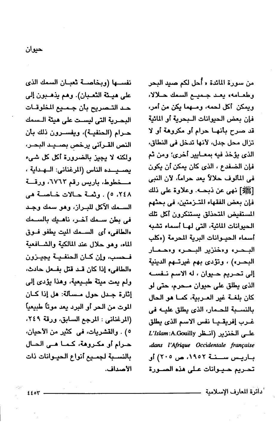 من سورة المائدة "أُحل لكم صيد البحر وطعامه" يعد جميع السمك حلالا، ويمكن أكل لحمه، ومهما يكن من أمر، فإن بعض الحيوانات البحرية أو المائية قد صرح بأنها حرام أو مكروهة أو لا تزال محل جدل، لأنها تدخل في النطاق، الذي يؤخذ فيه بمعايير أخرى؛ ومن ثم فإن الضفدع، الذي كان يمكن أن يكون في المألوف حلالا يعد حراما، لأن النبي [- صلى الله عليه وسلم -] نهي عن ذبحه. وعلاوة على ذلك فإن بعض الفقهاء المتزمتين، في بحثهم المستفيض المتحذلق يستنكرون أكل تلك الحيوانات المائية، التي لها أسماء تشبه أسماء الحيوانات البرية المحرمة ("كلب البحر"، و"خنزير البحر" و"حمار البحر")، وتؤدى بهم غيرتهم الدينية إلى تحريم حيوان، له الاسم نفسه الذي يطلق على حيوان محرم، حتى لو كان بلغة غير العربية، كما هو الحال بالنسبة للحمار، الذي يطلق عليه في غرب إفريقيا نفس الاسم الذي يطلق على الخنزير (انظر L,Islam: A.Gouilly dans l,Afrique Occidentale _francaise باريس سنة 1952، ص 205) أو تحريم حيوانات على هذه الصورة نفسها (وبخاصة ثعبان السمك الذي على هيئة الثعبان). وهم يذهبون إلى حد التصريح بأن جميع المخلوقات البحرية التي ليست على هيئة السمك حرام (الحنفية)، ويفسرون ذلك بأن النص القرآني يرخص بصيد البحر، ولكنه لا يجيز بالضرورة أكل كل شيء يصيده الناس (المرغنانى: الهداية، مخطوط، باريس رقم 6763، ورقة 5، 248). وثمة حالات خاصة هي السمك الآكل للبراز، وهو سمك وجد في بطن سمك آخر، ناهيك بالسمك "الطافي" أي السمك الميت يطفو فوق الماء، وهو حلال عند المالكية والشافعية فحسب، وإن كان الحنفية يجيزون "الطافي" إذا كان قد قتل بفعل حادث، ولم يمت ميتة طبيعية، وهذا يؤدى إلى إثارة جدل حول مسألة: هل إذا كان الموت من الحر أو البرد يعد موتًا طبيعيًا (المرغناني: المرجع السابق، ورقة 249، 5). والقشريات، في كثير من الأحيان، حرام أو مكروهة، كما هي الحال بالنسبة لجميع أنواع الحيوانات ذات الأصداف.