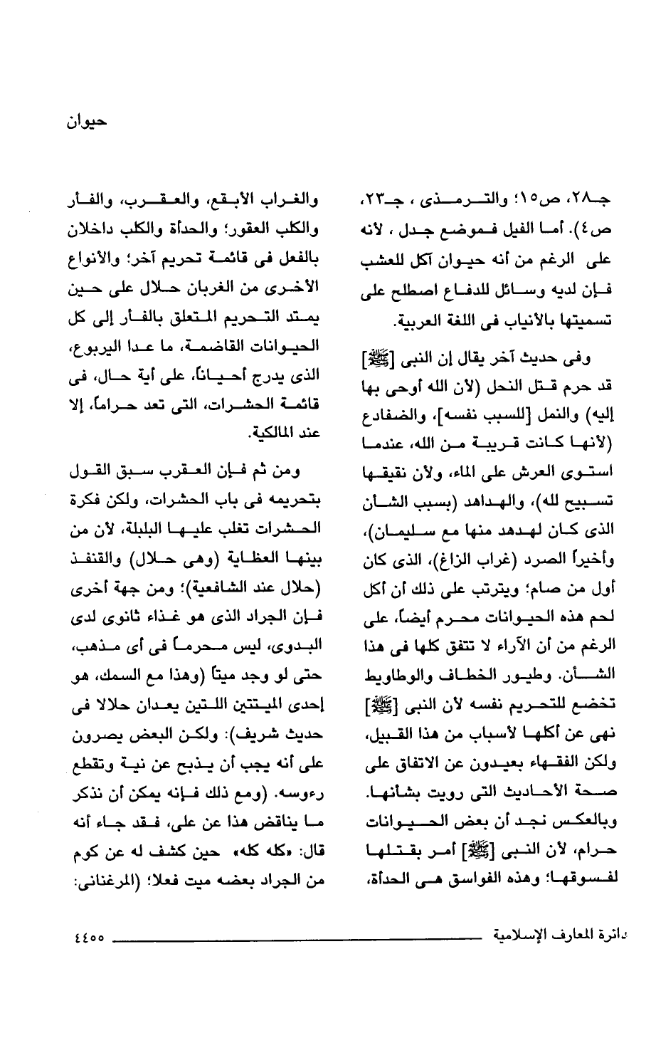 ومن ثم فإن العقرب سبق القول بتحريمه في باب الحشرات، ولكن فكرة الحشرات تغلب عليها البلبلة، لأن من بينها العظاية (وهي حلال) والقنفذ (حلال عند الشافعية)؛ ومن جهة أخرى فإن الجراد الذي هو غذاء ثانوى لدى البدوى، ليس محرمًا في أي مذهب، حتى لو وجد ميتًا (وهذا مع السمك، هو إحدى الميتتين اللتين يعدان حلالا في حديث شريف): ولكن البعض يصرون على أنه يجب أن يذبح عن نية وتقطع رءوسه. (ومع ذلك فإنه يمكن أن نذكر ما يناقض هذا عن على، فقد جاء أنه قال: "كله كله" حين كشف له عن كوم من الجراد بعضه ميت فعلا؛ (المرغناني:
