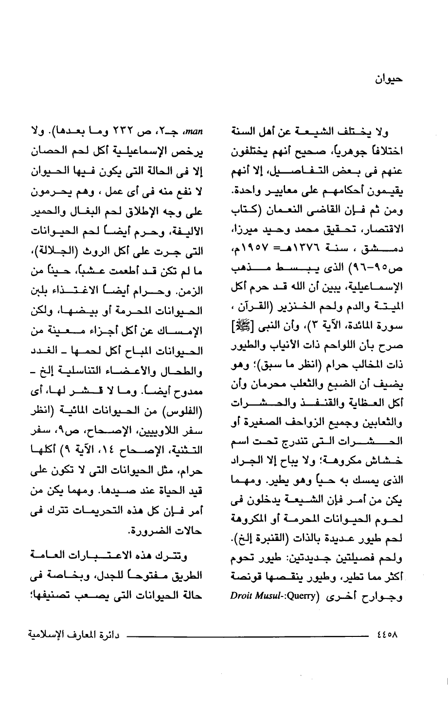 ولا يختلف الشيعة عن أهل السنة اختلافًا جوهريًا، صحيح أنهم يختلفون عنهم في بعض التفاصيل، إلا أنهم يقيمون أحكامهم على معايير واحدة. ومن ثم فإن القاضى النعمان (كتاب الاقتصار، تحقيق محمد وحيد ميرزا، دمشق، سنة 1376 هـ = 1957 م، ص 95 - 96) الذي يبسط مذهب الإسماعيلية، يبين أن الله قد حرم أكل الميتة والدم ولحم الخنزير (القرآن، سورة المائدة، الآية 3)، وأن النبي [- صلى الله عليه وسلم -] صرح بأن اللواحم ذات الأنياب والطيور ذات المخالب حرام (انظر ما سبق)؛ وهو يضيف أن الضبع والثعلب محرمان وأن أكل العظاية والقنفذ والحشرات والثعابين وجميع الزواحف الصغيرة أو الحشرات التي تندرج تحت اسم خشاش مكروهة؛ ولا يباح إلا الجراد الذي يمسك به حيا وهو يطير. ومهما يكن من أمر فإن الشيعة يدخلون في لحوم الحيوانات المحرمة أو المكروهة لحم طيور عديدة بالذات (القنبرة إلخ). ولحم فصيلتين جديدتين: طيور تحوم أكثر مما تطير، وطيور ينقصها قونصة وجوارح أخرى (Droit Musul-: Querry man جـ 2، ص 232 وما بعدها). ولا يرخص الإسماعيلية أكل لحم الحصان إلا في الحالة التي يكون فيها الحيوان لا نفع منه في أي عمل، وهم يحرمون على وجه الإطلاق لحم البغال والحمير الأليفة، وحرم أيضًا لحم الحيوانات التي جرت على أكل الروث (الجلالة)، ما لم تكن قد أطعمت عشبًا، حينًا من الزمن. وحرام أيضًا الاغتذاء بلبن الحيوانات المحرمة أو بيضها، ولكن الإمساك عن أكل أجزاء معينة من الحيوانات المباح أكل لحمها -الغدد والطحال والأعضاء التناسلية إلخ- ممدوح أيضًا. وما لا قشر لها، أي (الفلوس) من الحيوانات المائية (انظر سفر اللاوييين، الإصحاح، ص 9، سفر التثنية، الإصحاح 14، الآية 9) أكلها حرام، مثل الحيوانات التي لا تكون على قيد الحياة عند صيدها. ومهما يكن من أمر فإن كل هذه التحريمات تترك في حالات الضرورة.