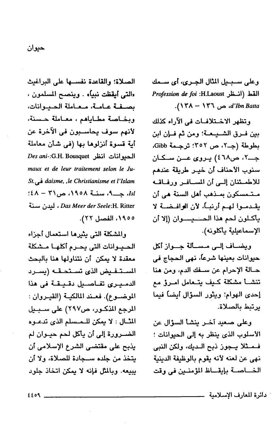 وعلى صعيد آخر ينشأ السؤال عن الأسلوب الذي ينظر به إلى الحيوانات؛ فمثلا يجوز ذبح الديك، ولكن النبي نهي عن لعنه لأنه يقوم بالوظيفة الدينية الخاصة بإيقاظ المؤمنين في وقت الصلاة؛ والقاعدة نفسها على البراغيث "التي أيقظت نبيا". وينصح المسلمون، بصفة عامة، معاملة الحيوانات، وبخاصة مطاياهم، معاملة حسنة، لأنهم سوف يحاسبون في الآخرة عن أية قسوة أنزلوها بها (في شأن معاملة الحيوانات انظر Des ani-: G.H. Bousquet maux et de leur traitement selon le Ju- daisme .. le Christianisme et l,Islam في St. Isl، جـ 9، سنة 1958، ص 31 - 48؛ Das Meer der Seele: H. Ritter . ليدن سنة 1955، الفصل 22).