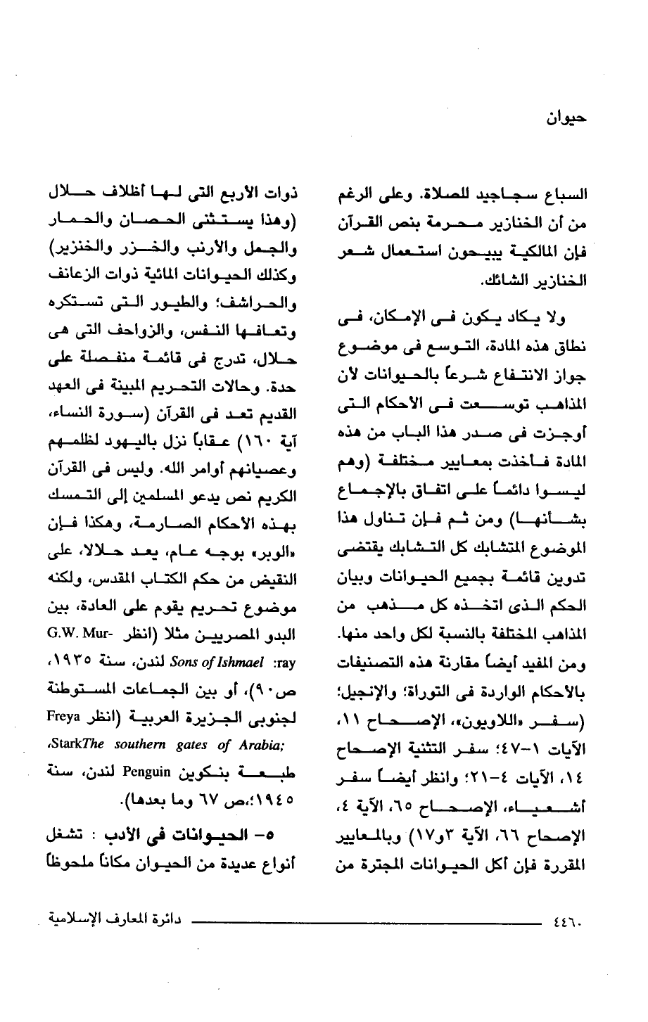 ولا يكاد يكون في الإمكان، في نطاق هذه المادة، التوسع في موضوع جواز الانتفاع شرعًا بالحيوانات لأن المذاهب توسعت في الأحكام التي أوجزت في صدر هذا الباب من هذه المادة فأخذت بمعايير مختلفة (وهم ليسوا دائمًا على اتفاق بالإجماع بشأنها) ومن ثم فإن تناول هذا الموضوع المتشابك كل التشابك يقتضى تدوين قائمة بجميع الحيوانات وبيان الحكم الذي اتخذه كل مذهب من المذاهب المختلفة بالنسبة لكل واحد منها. ومن المفيد أيضًا مقارنة هذه التصنيفات بالأحكام الواردة في التوراة؛ والإنجيل؛ (سفر "اللاويون"، الإصحاح 11، الآيات 1 - 47؛ سفر التثنية الإصحاح 14، الآيات 4 - 21 وانظر أيضًا سفر أشعياء، الإصحاح 65، الآية 4، الإصحاح 66، الآية 3 و 17) وبالمعايير المقررة فإن أكل الحيوانات المجترة من ذوات الأربع التي لها أظلاف حلال (وهذا يستثنى الحصان والحمار والجمل والأرنب والخزر والخنزير) وكذلك الحيوانات المائية ذوات الزعانف والحراشف؛ والطيور التي تستكره وتعافها النفس، والزواحف التي هي حلال، تدرج في قائمة منفصلة على حدة. وحالات التحريم المبينة في العهد القديم تعد في القرآن (سورة النساء، آية 160) عقابًا نزل باليهود لظلمهم وعصيانهم أوامر الله. وليس في القرآن الكريم نص يدعو المسلمين إلى التمسك بهذه الأحكام الصارمة، وهكذا فإن "الوبر" بوجه عام، يعد حلالا، على النقيض من حكم الكتاب المقدس، ولكنه موضوع تحريم يقوم على العادة، بين البدو المصريين مثلا (انظر - G.W. Mur Sons of Ishmael: ray لندن، سنة 1935، ص 90)، أو بين الجماعات المستوطنة لجنوبى الجزيرة العربية (انظر Freya Stark The southern gates of Arabia طبعة بنكوين Penguin لندن، سنة 1945؛ ، ص 67 وما بعدها).