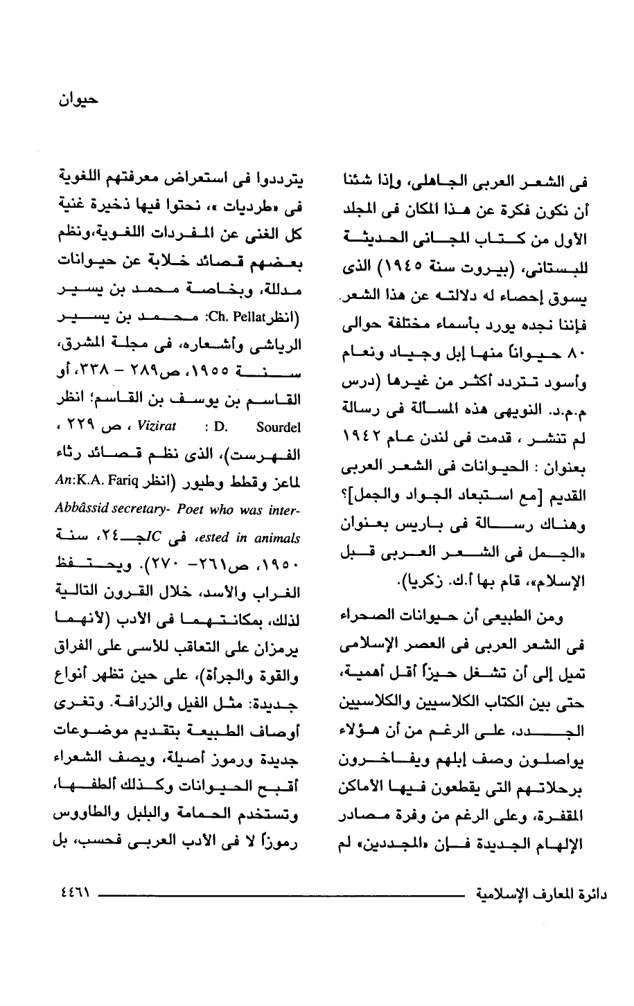 في الشعر العربي الجاهلي، وإذا شئنا أن نكون فكرة عن هذا المكان في المجلد الأول من كتاب المجانى الحديثة للبستانى، (بيروت سنة 1945) الذي يسوق إحصاء له دلالته عن هذا الشعر. فإننا نجده يورد بأسماء مختلفة حوالى 80 حيوانًا منها إبل وجياد ونعام وأسود تتردد أكثر من غيرها (درس م. م. د. النويهي هذه المسألة في رسالة لم تنشر، قدمت في لندن عام 1942 بعنوان: الحيوانات في الشعر العربي القديم [مع استبعاد الجواد والجمل]؟ وهناك رسالة في باريس بعنوان "الجمل في الشعر العربي قبل الإسلام"، قام بها أ. ك. زكريا).