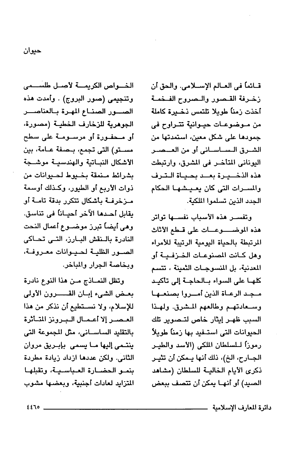 قائمًا في العالم الإسلامى. والحق أن زخرفة القصور والصروح الفخمة أخذت زمنًا طويلا تلتمس ذخيرة كاملة من موضوعات حيوانية تتراوح في جمودها على شكل معين، استمدتها من الشرق الساسانى أو من العصر اليونانى المتأخر في المشرق، وارتبطت هذه الذخيرة بعد بحياة الترف والمسرات التي كان يعيشها الحكام الجدد الذين تسلموا الملكية.