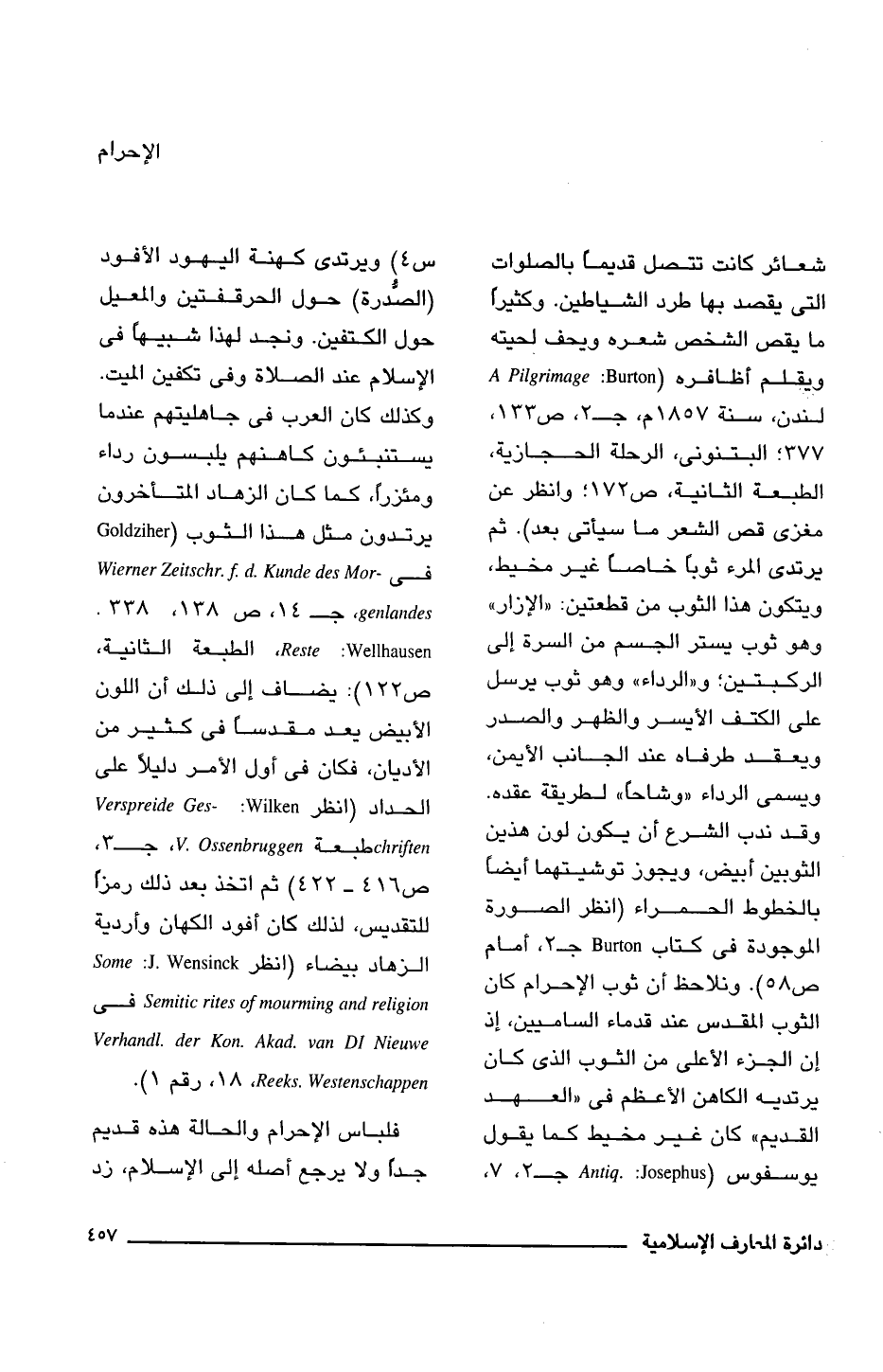 شعائر كانت تتصل قديمًا بالصلوات التي يقصد بها طرد الشياطين. وكثيرًا ما يقص الشخص شعره ويحف لحيته ويقلم أظافره (A Pilgrimage: Burton لندن، سنة 1857 م، جـ 2، ص 133، 377؛ البتنونى، الرحلة الحجازية، الطبعة الثانية، ص 172؛ وانظر عن مغزى قص الشعر ما سيأتى بعد). ثم يرتدى المرء ثوبًا خاصًا غير مخيط، ويتكون هذا الثوب من قطعتينْ "الإزار" وهو ثوب يستر الجسم من السرة إلى الركبتين؛ و"الرداء" وهو ثوب يرسل على الكتف الأيسر والظهر والصدر ويعقد طرفاه عند الجانب الأيمن، ويسمى الرداء "وشاحًا" لطريقة عقده. وقد ندب الشرع أن يكون لون هذين الثوبين أبيض، ويجوز توشيتهما أيضًا بالخطوط الحمراء (انظر الصورة الموجودة في كتاب، Burton جـ 2، أمام ص 58). ونلاحظ أن ثوب الإحرام كان الثوب المقدس عند قدماء الساميين، إذ إن الجزء الأعلى من الثوب الذي كان يرتديه الكاهن الأعظم في "العهد القديم" كان غير مخيط كما يقول يوسفوس (Antiq: Josephus جـ 2، 7، س 4) ويرتدى كهنة اليهود الأفود (الصُّدرة) حول الحرقفتين والمعيل حول الكتفين. ونجد لهذا شبيهًا في الإسلام عند الصلاة وفي تكفين الميت. وكذلك كان العرب في جاهليتهم عندما يستنبئون كاهنهم يلبسون رداء ومئزرًا، كما كان الزهاد المتأخرون يرتدون مثل هذا الثوب (Goldziher في Wierner Zeitschr. F. Kunde des Mor - genlandes، جـ 14, ص 138، 338. Reste: Wellhausen, الطبعة الثانية، ص 122): يضاف إلى ذلك أن اللون الأبيض يعد مقدسًا في كثير من الأديان، فكان في أول الأمر دليلًا على الحداد (انظر Wilken: Verpreide Ges- chriften طبعة V. Ossenbruggen، جـ 3، ص 416 - 422) ثم اتخذ بعد ذلك رمزًا للتقديس، لذلدُ كان أفود الكهان وأردية الزهاد بيضاء (انظر Some: J. Wensinck Semitic rites of mourming and religion فى Verhandl. der Kon. Akad. van DI Nieuwe Reeks. Westenschappen، 18، رقم 1).
