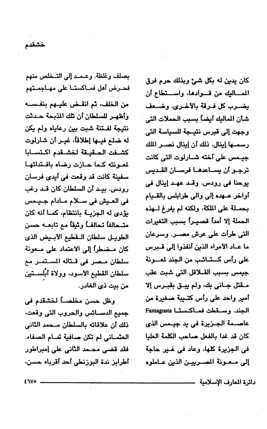 كان يدين له بكل شئ وبذلك حرم فرق المماليك من قوادها، واستطاع أن يضرب كل فرقة بالأخرى. وضعف شأن المماليك أيضًا بسبب الحملات التي وجهت إلى قبرس نتيجة للسياسة التي رسمها إينال. ذلك أن إينال نصر الملك جيمس على أخته شارلوت التي كانت ترجو أن يساعدها فرسان القديس يوحنا في رودس. وقد عهد إينال في أواخر عهده إلى والى طرابلس بالقيام بحملة على الملكة، ولكنه لم يفرغ لهذه الحملة إلا أمدًا قصيرًا بسبب التغيرات التي طرأت على عرش مصر. وسرعان ما عاد الأمراء الذين أنفذوا إلى قبرس على رأس كتائب من الجند لمعونة جيمس بسبب القلاقل التي شبت عقب مقتل جانى بك، ولم يبق بقبرس إلا أمير واحد على رأس كتيبة صغيرة من الجند. وسقطت فماكستا Famagusta عاصمة الجزيرة في يد جيمس الذي كان قد غدا بالفعل صاحب الكلمة العليا في الجزيرة كلها، وعاد في غير حاجة إلى معونة المصريين الذين عاملوه بصلف وغلظة. وعمد إلى التخلص منهم فحرض أهل فماكستا على مهاجمتهم من الخلف، ثم انقض عليهم بنفسه وأظهر للسلطان أن تلك المذبحة حدثت نتيجة لفتنة شبت بين رعاياه ولم يكن له ضلع فيها إطلاقًا، غير أن شارلوت كشفت الحقيقة لخشقدم اكتسابا لمعونته كما حازت رضاه بافتدائها سفينة كانت قد وقعت في أيدى فرسان رودس. بيد أن السلطان كان قد رغب في العيش في سلام مادام جيمس يؤدى له الجزية بانتظام، كما أنه كان متحالفًا تحالفًا وثيقًا مع تابعه حسن الطويل سلطان القطيع الأبيض الذي كان مضطرًا إلى الاعتماد على معونة سلطان مصر في قتاله المستمر مع سلطان القطيع الأسود، وولاة أبُلِستين من بيت ذي الغادر.