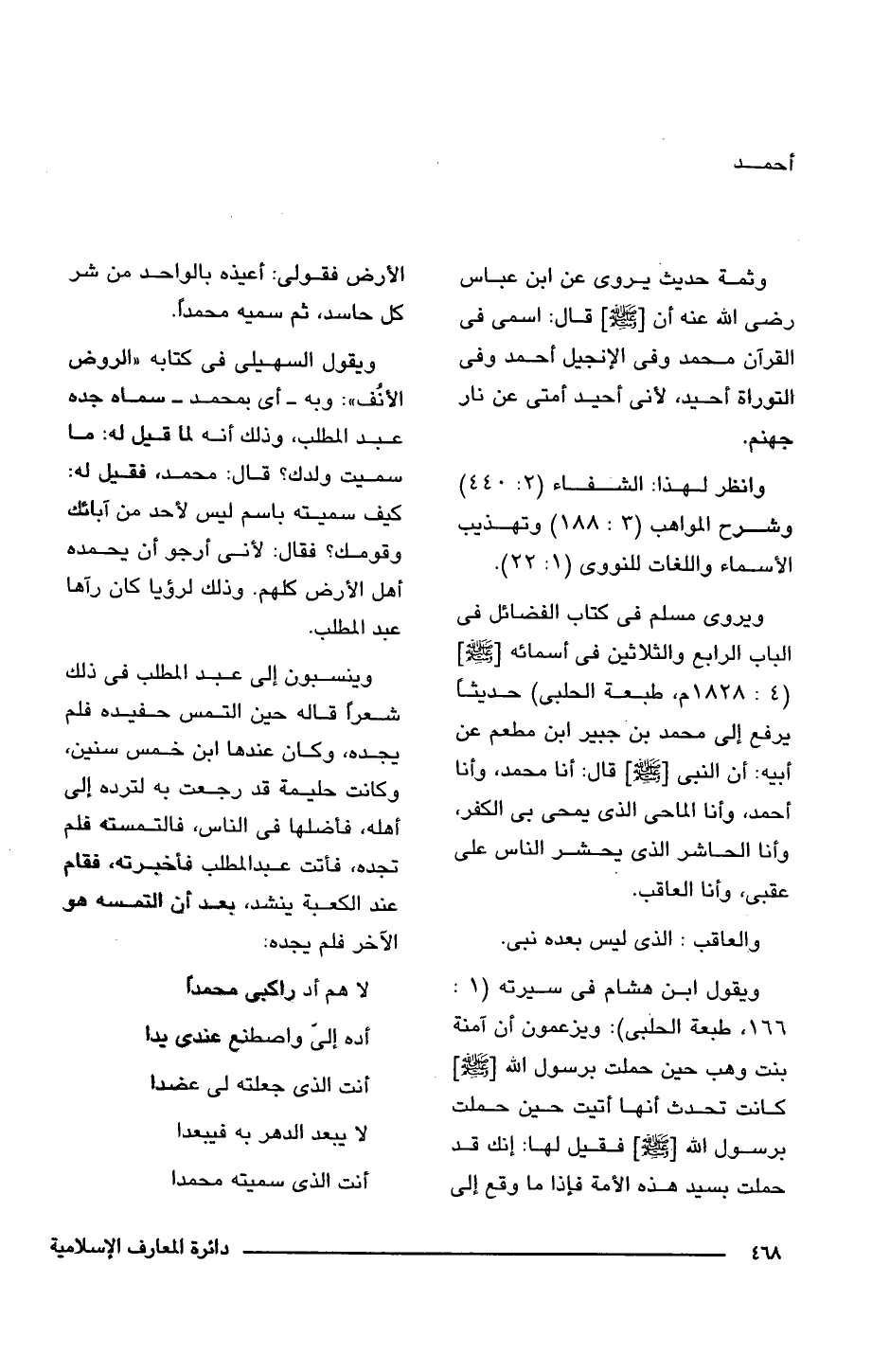 ويروى مسلم فى كتاب الفضائل فى الباب الرابع والثلاثين فى أسمائه [- صلى الله عليه وسلم -] (4: 1828 م، طبعة الحلبى) حديثًا يرفع إلى محمد بنْ جبير ابن مطعم عن أبيه: أن النبى [- صلى الله عليه وسلم -] قال: أنا محمد، وأنا أحمد، وأنا الماحى الذى يمحى بي الكفر، وأنا الحاشر الذى يحشر الناس على عقبى، وأنا العاقب.