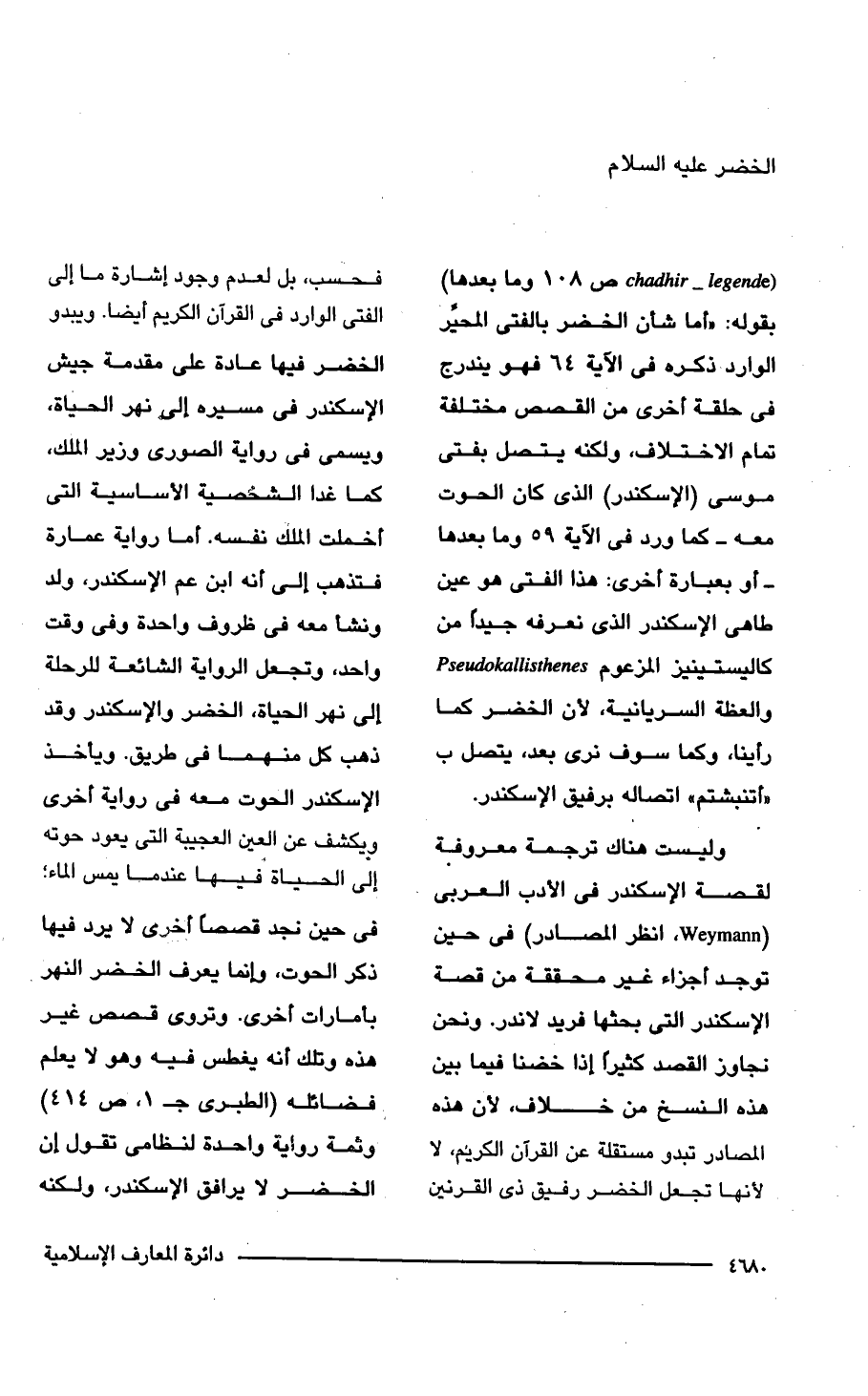 وليست هناك ترجمة معروفة لقصة الإسكندر في الأدب العربي (Weymann , انظر المصادر) في حين توجد أجزاء غير محققة من قصة الإسكندر التي بحثها فريد لاندر. ونحن نجاوز القصد كثيرًا إذا خضنا فيما بين هذه النسخ من خلاف، لأن هذه المصادر تبدو مستقلة عن القرآن الكريم، لا لأنها تجعل الخضر رفيق ذي القرنين فحسب، بل لعدم وجود إشارة ما إلى الفتى الوارد في القرآن الكريم أيضًا. ويبدو الخضر فيها عادة على مقدمة جيش الإسكندر في مسيره إلى نهر الحياة، ويسمى في رواية الصورى وزير الملك، كما غدا الشخصية الأساسية التي أخملت الملك نفسه. أما رواية عمارة فتذهب إلى أنه ابن عم الإسكندر، ولد ونشأ معه في ظروف واحدة وفي وقت واحد، وتجعل الرواية الشائعة للرحلة إلى نهر الحياة، الخضر والإسكندر وقد ذهب كل منهما في طريق. ويأخذ الإسكندر الحوت معه في رواية أخرى ويكشف عن العين العجيبة التي يعود حوته إلى الحياة فيها عندما يمس الماء؛ في حين نجد قصصًا أخرى لا يرد فيها ذكر الحوت، وإنما يعرف الخضر النهر بأمارات أخرى. وتروى قصص غير هذه ودلك أنه يغطس فيه وهو لا يعلم فضائله (الطبرى جـ 1، ص 414) وثمة رواية واحدة لنظامى تقول إن الخضر لا يرافق الإسكندر، ولكنه