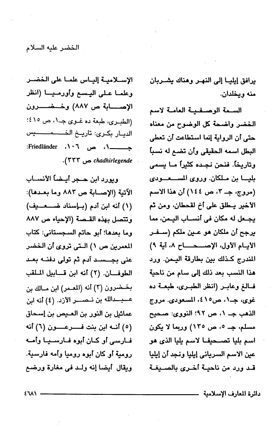السمة الوصفية العامة لاسم الخضر واضحة كل الوضوح من معناه حتى أن الرواية إنما استطاعت أن تعطى البطل اسمه الحقيقي وأن تضع له نسبًا وتاريخًا. فنحن نجده كثيرًا ما يسمى بليا بن ملكان. وروى المسعودي (مروج، جـ 3، ص 144) أن هذا الاسم الأخير يطلق على أخ لقحطان، ومن ثم يجعل له مكان في أنساب اليمن، مما يرجح أن ملكان هو عين ملكم (سفر الأيام الأول، الإصحاح 8، آية 9) المندرج كذلك بين بطارقة اليمن. ورد هذا النسب بعد ذلك إلى سام من ناحية فالغ وعابر (انظر الطبرى، طبعة ده غوى، جـ 1، ص 415, المسعودي. مروج الذهب جـ 1، ص 92؛ النووى: صحيح مسلم، جـ 5، ص 135) وربما لا يكون اسم بليا تصحيفا لاسم يليا الذي هو عين الاسم السريانى إيليا ونجد أن إيليا قد ورد من ناحية أخرى بالصيغة الإسلامية إلياس علما على الخضر وعلما على اليسع وأورميا (انظر الإصابة ص 887) وخضرون (الطبرى، طبعة ده غوى جـ 1, ص 415؛ الديار بكري: تاريخ الخميس جـ 1، ص 106، Friedlânder: chadhirlegende ص 333).