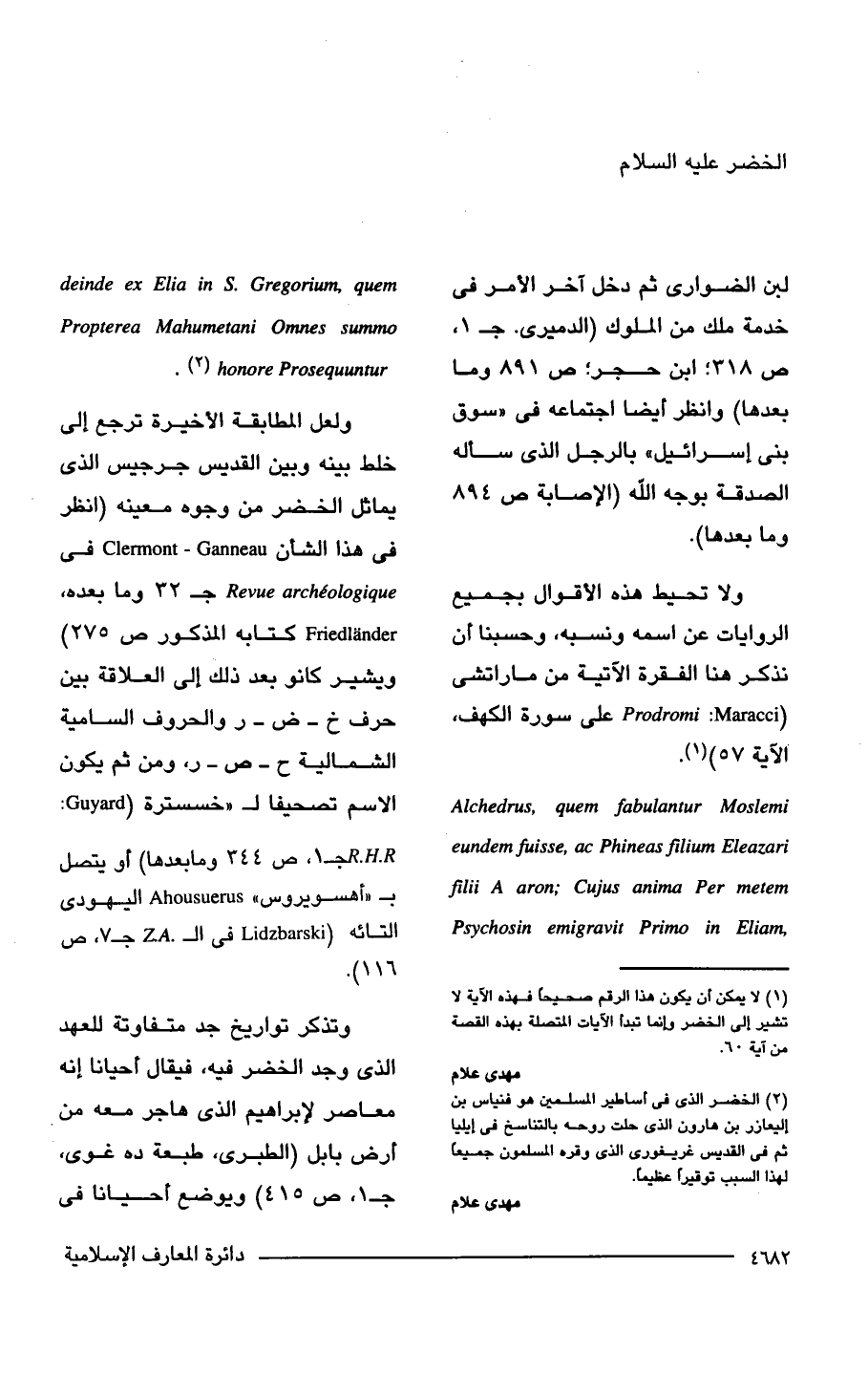 (¬2) الخضر الذي في أساطير المسلمين هو فنياس ابن إليعازر بن هارون الذي حلت روحه بالتناسخ في إيليا ثم في القديس غريغورى الذي وقره المسلمون جميعًا لهذا السبب توقيرا عظيمًا.