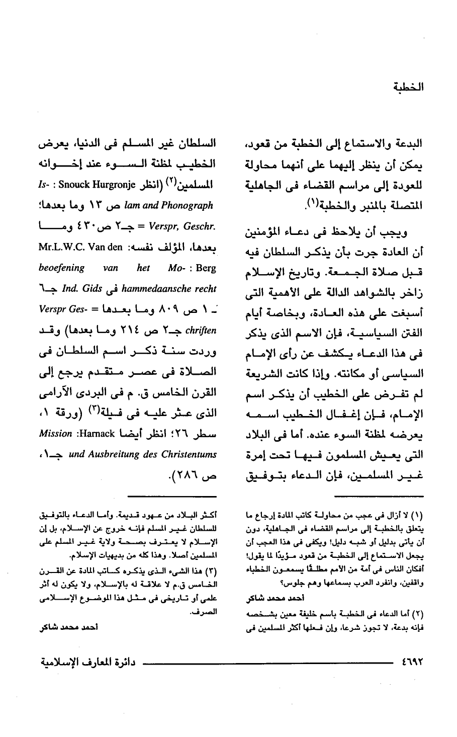 بعدها، المؤلف نفسه: Mr.L.W.C Van den beoefening van het Mo-: Berg hammedaansche recht في Ind. Gids جـ 16 ص 809 وما بعدها = Verspr Ges - chriten جـ 2 ص 214 وما بعدها) وقد وردت سنة ذكر اسم السلطان في الصلاة في عصر متقدم يرجع إلى القرن الخامس ق. م في البردى الآرامى الذي عشر عليه في فيلة (¬3) (ورقة 1، سطر 26؛ انظر أيضا Mission: Harnack und Ausbreitung des Christentums جـ 1، ص 286).