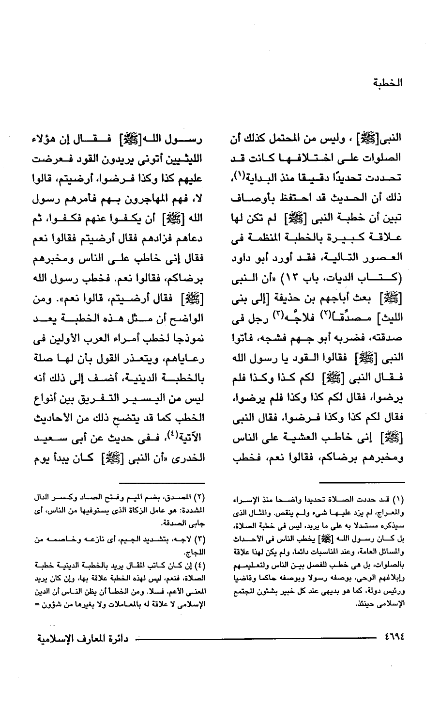 النبي [- صلى الله عليه وسلم -]، وليس من المحتمل كذلك أن الصلوات على اختلافها كانت قد تحددت تحديًدا دقيقا منذ البداية (¬1)، ذلك أن الحديث قد احتفظ بأوصاف تبين أن خطبة النبي [- صلى الله عليه وسلم -] لم تكن لها علاقة كبيرة بالخطبة المنظمة في العصور التالية، فقد أورد أبو داود (كتاب الديات، باب 13) "أن النبي [- صلى الله عليه وسلم -] بعث أبا جهم بن حذيفة [إلى بني الليث] مصدِّقا (¬2) فلاجه (¬3) رجل في صدقته، فضربه أبو جهم فشجه، فأتوا النبي [- صلى الله عليه وسلم -] فقالوا القود يا رسول الله فقال النبي [- صلى الله عليه وسلم -] لكم كذا وكذا فلم يرضوا، فقال لكم كذا وكذا فلم يرضوا، فقال لكم كذا وكذا فرضوا، فقال النبي [- صلى الله عليه وسلم -] إني خاطب العشية على الناس ومخبرهم برضاكم، فقالوا نعم، فخطب رسول الله [- صلى الله عليه وسلم -] فقال إن هؤلاء الليثيين أتونى يريدون القود فعرضت عليهم كذا وكذا فرضوا، أرضيتم، قالوا لا، فهم المهاجرون بهم فأمرهم رسول الله [- صلى الله عليه وسلم -] أن يكفوا عنهم فكفوا، ثم دعاهم فزادهم فقال أرضيتم فقالوا نعم فقال إني خاطب على الناس ومخبرهم برضاكم، فقالوا نعم. فخطب رسول الله [- صلى الله عليه وسلم -] فقال أرضيتم، قالوا نعم". ومن الواضح أن مثل هذه الخطبة يعد نموذجا لخطب أمراء العرب الأولين في رعاياهم، ويتعذر القول بأن لها صلة بالخطبة الدينية، أضف إلى ذلك أنه ليس من اليسير التفريق بين أنواع الخطب كما قد يتضح ذلك من الأحاديث الآتية (¬4)، ففي حديث عن أبي سعيد الخدري "أن النبي [- صلى الله عليه وسلم -] كان يبدأ يوم
