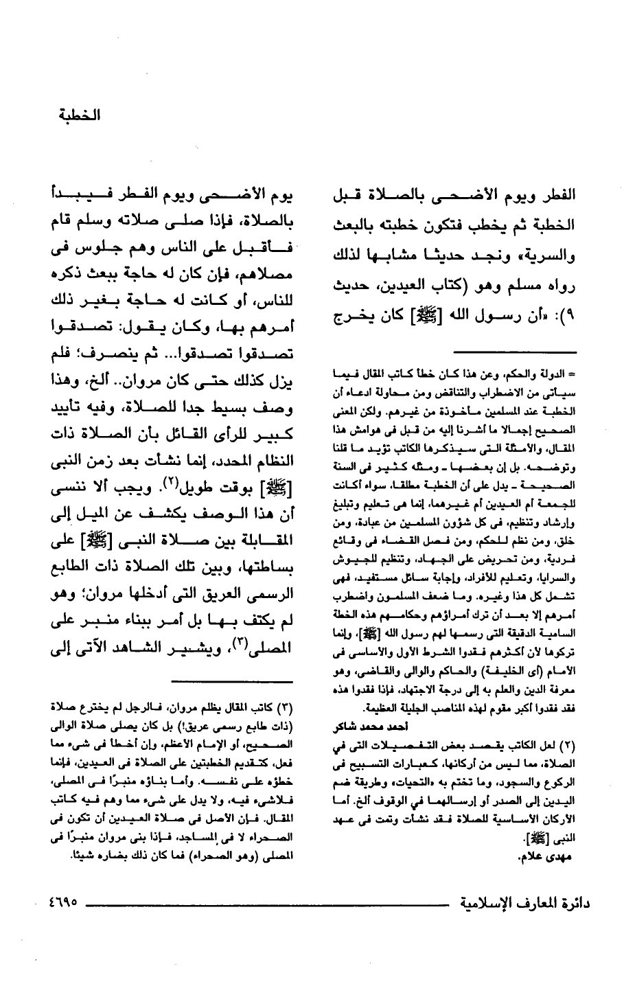 = الدولة والحكم، وعن هذا كان خطأ كاتب المقال فيما سيأتى من الاضطراب والتناقض ومن محاولة ادعاء أن الخطبة عند المسلمين مأخوذة من غيرهم. ولكن المعنى الصحيح إجمالا ما أشرنا إليه من قبل في هوامش هذا المقال، والأمثلة التي سيذكرها الكاتب تؤيد ما قلنا وتوضحه. بل إن بعضها -ومثله كثير في السنة الصحيحة- يدل على أن الخطبة مطلقا، سواء أكانت للجمعة أم العيدين أم غيرهما، إنما هي تعليم وتبليغ وإرشاد وتنظيم، في كل شؤون المسلمين من عبادة، ومن خلق، ومن نظم للحكم، ومن فصل القضاء في وقائع فردية، ومن تحريض على الجهاد، وتنظيم للجيوش والسرايا، وتعليم للأفراد، وإجابة سائل مستفيد، فهي تشمل كل هذا وغيره. وما ضعف المسلمون واضطرب أمرهم إلا بعد أن ترك أمراؤهم وحكامهم هذه الخطة السامية الدقيقة التي رسمها لهم رسول الله [- صلى الله عليه وسلم -]، وإنما تركوها لأن أكثرهم فقدوا الشرط الأول والأساسي في الإمام (أي الخليفة) والحاكم والوالي والقاضي، وهو معرفة الدين والعلم به إلى درجة الاجتهاد، فإذا فقدوا هذه فقد فقدوا أكبر مقوم لهذه المناصب الجليلة العظيمة.