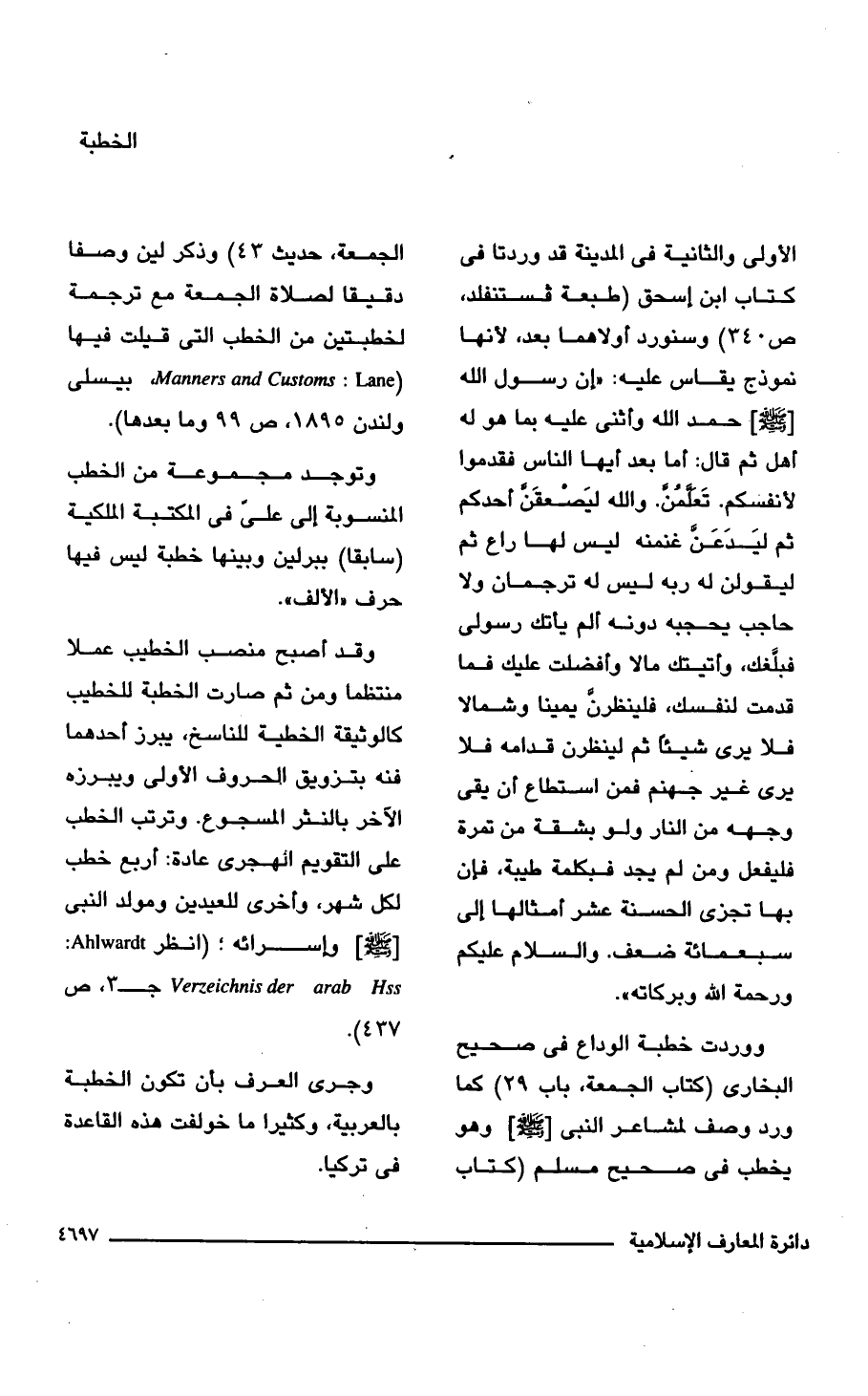 ووردت خطبة الوداع في صحيح البخاري (كتاب الجمعة، باب 29) كما ورد وصف لمشاعر النبي [- صلى الله عليه وسلم -] وهو يخطب في صحيح مسلم (كتاب الجمعة، حديث 43) وذكر لين وصفا دقيقا لصلاة الجمعة مع ترجمة لخطبتين من الخطب التي قيلت فيها (Manners and Customs: Lane بيسلى ولندن 1895 , ص 99 وما بعدها).