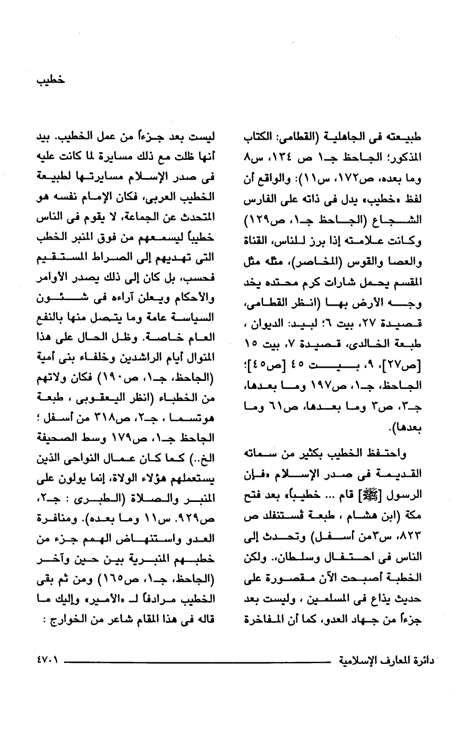 طبيعته في الجاهلية (القطامى: الكتاب المذكور؛ الجاحظ جـ 1 ص 134 , س 8 وما بعده ص 172 س 11): والواقع أن لفظ "خطيب" يدل في ذاته على الفارس الشجاع (الجاحظ جـ 1، ص 129) وكانت علامته إذا برز للناس، القناة والعصا والقوس (المخاصر)، مثله مثل المقسم يحمل شارات كرم محتده يخد وجه الأرض بها (انظر القطامى، قصيدة 27، بيت 6؛ لبيد: الديوان، طبعة الخالدى، قصيدة 7، بيت 15 [ص 27]، 9, بيت 45 [ص 45]؛ الجاحظ، جـ 1، ص 197 وما بعدها، جـ 3، ص 3 وما بعدها، ص 61 وما بعدها).