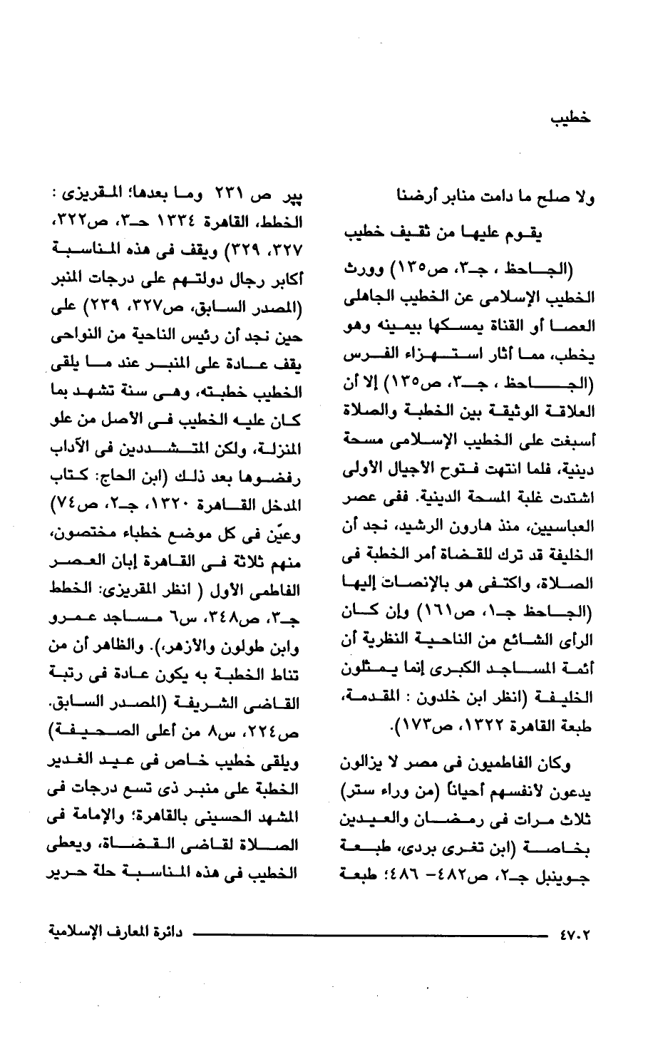 (الجاحظ، جـ 3، ص 135) وورث الخطيب الإسلامي عن الخطيب الجاهلي العصا أو القناة يمسكها بيمينه وهو يخطب، مما أثار استهزاء الفرس (الجاحظ، جـ 3، ص 135) إلا أن العلاقة الوثيقة بين الخطبة والصلاة أسبغت على الخطيب الإِسلامي مسحة دينية، فلما انتهت فتوح الأجيال الأولى اشتدت غلبة المسحة الدينية. ففي عصر العباسيين، منذ هارون الرشيد، نجد أن الخليفة قد ترك للقضاة أمر الخطبة في الصلاة، واكتفى هو بالإنصات إليها (الجاحظ جـ 1، ص 161) , وإن كان الرأى الشائع من الناحية النظرية أن أئمة المساجد الكبرى إنما يمثلون الخليفة (انظر ابن خلدون: المقدمة، طبعة القاهرة 1322 , ص 173).