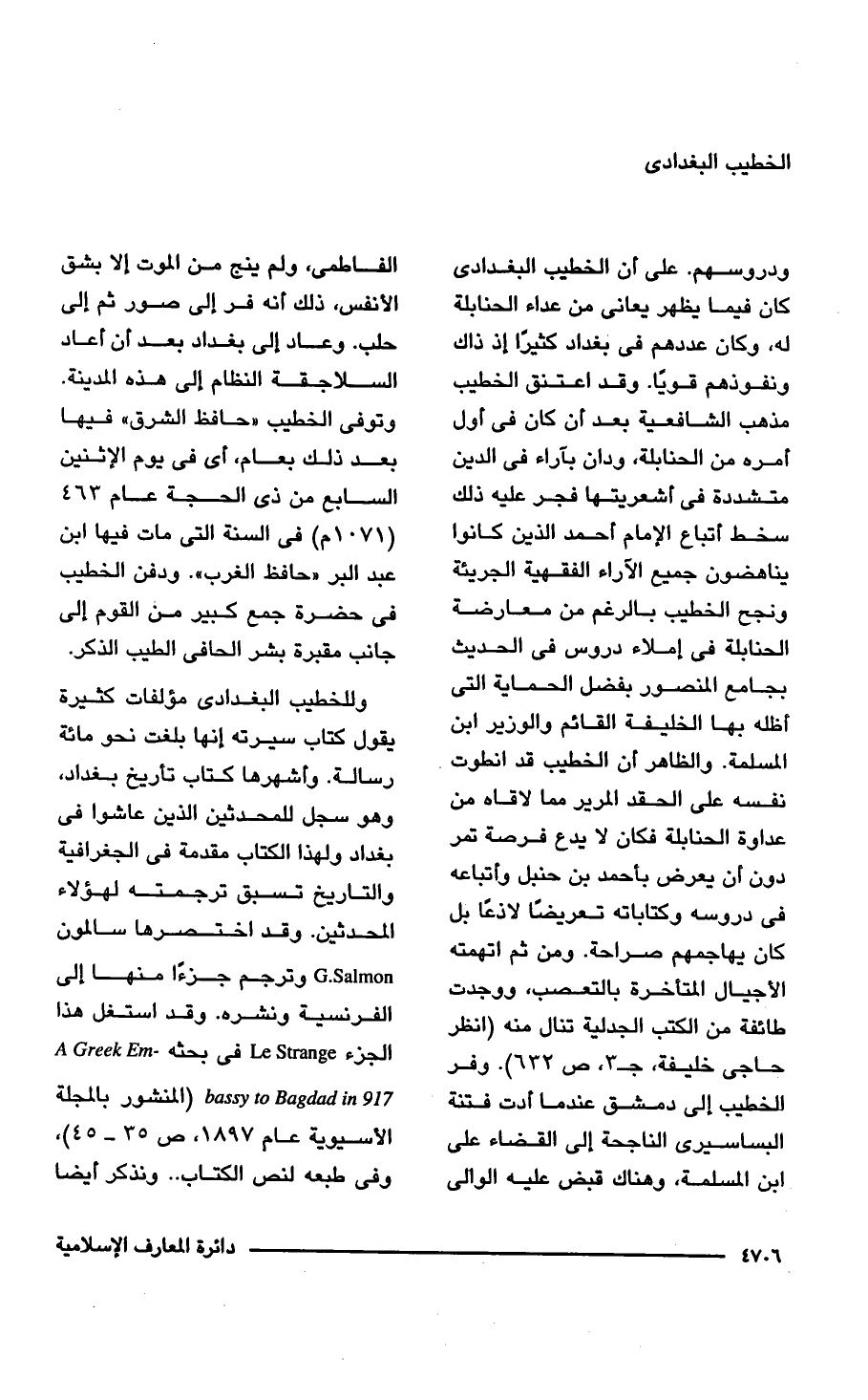 ودروسهم. على أن الخطيب البغدادى كان فيما يظهر يعاني من عداء الحنابلة له، وكان عددهم في بغداد كثيرًا إذ ذاك ونفوذهم قويًّا. وقد اعتنق الخطيب مذهب الشافعية بعد أن كان في أول أمره من الحنابلة، ودان بآراء في الدين متشددة في أشعريتها فجر عليه ذلك سخط أتباع الإِمام أحمد الذين كانوا يناهضون جميع الآراء الفقهية الجريئة ونجح الخطيب بالرغم من معارضة الحنابلة في إملاء دروس في الحديث بجامع المنصور بفضل الحماية التي أظله بها الخليفة القائم والوزير ابن المسلمة. والظاهر أن الخطيب قد انطوت نفسه على الحقد المرير مما لاقاه من عداوة الحنابلة فكان لا يدع فرصة تمر دون أن يعرض بأحمد بن حنبل وأتباعه في دروسه وكتاباته تعريضًا لاذعًا بل كان يهاجمهم صراحة. ومن ثم اتهمته الأجيال المتأخرة بالتعصب، ووجدت طائفة من الكتب الجدلية تنال منه (انظر حاجى خليفة، جـ 3، ص 632). وفر الخطيب إلى دمشق عندما أدت فتنة البساسيرى الناجحة إلى القضاء على ابن المسلمة، وهناك قبض عليه الوالي الفاطمى، ولم ينج من الموت إلا بشق الأنفس، ذلك أنه فر إلى صور ثم إلى حلب. وعاد إلى بغداد بعد أن عاد السلاجقة النظام إلى هذه المدينة. وتوفي الخطيب "حافظ الشرق" فيها بعد ذلك بعام، أي في يوم الإثنين السابع من ذي الحجة عام 463 (1071 م) في السنة التي مات فيها ابن عبد البر "حافظ الغرب". ودفن الخطيب في حضرة جمع كبير من القوم إلى جانب مقبرة بشر الحافي الطيب الذكر.