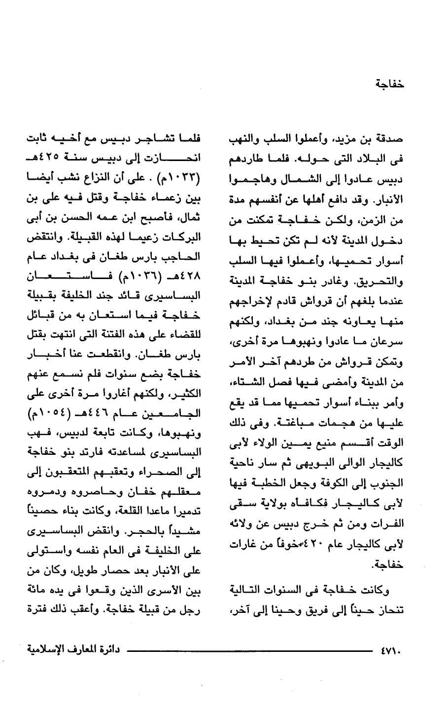 صدقة بن مزيد، وأعملوا السلب والنهب في البلاد التي حوله. فلما طاردهم دبيس عادوا إلى الشمال وهاجموا الأنبار. وقد دافع أهلها عن أنفسهم مدة من الزمن، ولكن خفاجة تمكنت من دخول المدينة لأنه لم تكن تحيط بها أسوار تحميها، وأعملوا فيها السلب والتحريق. وغادر بنو خفاجة المدينة عندما بلغهم أن قرواش قادم لإخراجهم منها يعاونه جند من بغداد، ولكنهم سرعان ما عادوا ونهبوها مرة أخرى، وتمكن قرواش من طردهم آخر الأمر من المدينة وأمضى فيها فصل الشتاء، وأمر ببناء أسوار تحميها مما قد يقع عليها من هجمات مباغتة. وفي ذلك الوقت أقسم منيع يمين الولاء لأبي كاليجار الوالى البويهي ثم سار ناحية الجنوب إلى الكوفة وجعل الخطبة فيها لأبي كاليجار فكافأه بولاية سقى الفرات ومن ثم خرج دبيس عن ولائه لأبي كاليجار عام 420 خوفا من غارات خفاجة.