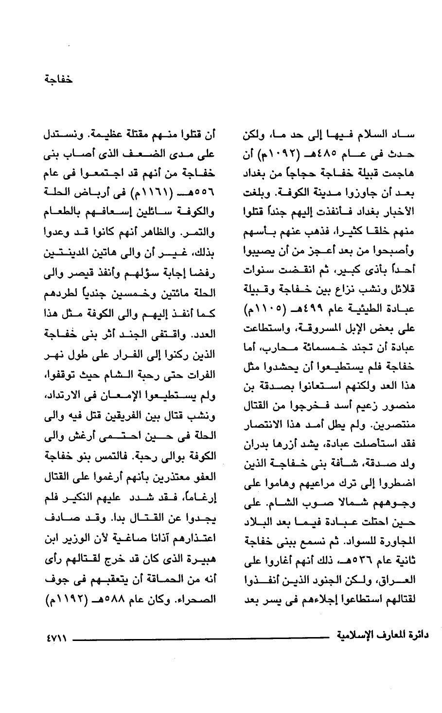 ساد السلام فيها إلى حد ما, ولكن حدث في عام 485 هـ (1092 م) أن هاجمت قبيلة خفاجة حجاجا من بغداد بعد أن جاوزوا مدينة الكوفة. وبلغت الأخبار بغداد فأنفذت إليهم جندًا قتلوا منهم خلقا كثيرا، فذهب عنهم بأسهم وأصبحوا من بعد أعجز من أن يصيبوا أحدا بأذى كبير، ثم انقضت سنوات قلائل ونشب نزاع بين خفاجة وقبيلة عبادة الطيئية عام 499 هـ (1105 م) على بعض الإبل المسروقة، واستطاعت عبادة أن تجند خمسمائة محارب، أما خفاجة فلم يستطيعوا أن يحشدوا مثل هذا العد ولكنهم استعانوا بصدقة بن منصور زعيم أسد فخرجوا من القتال منتصرين. ولم يطل أمد هذا الانتصار فقد استأصلت عبادة، يشد أزرها بدران ولد صدقة، شأفة بني خفاجة الذين اضطروا إلى ترك مراعيهم وهاموا على وجوههم شمالا صوب الشام. على حين احتلت عبادة فيما بعد البلاد المجاورة للسواد. ثم نسمع ببنى خفاجة ثانية عام 536 هـ، ذلك أنهم أغاروا على العراق، ولكن الجنود الذين أنفذوا لقتالهم استطاعوا إجلاءهم في يسر بعد أن قتلوا منهم مقتلة عظيمة. ونستدل على مدى الضعف الذي أصاب بني خفاجة من أنهم قد اجتمعوا في عام 556 هـ (1161 م) في أرباض الحلة والكوفة سائلين إسعافهم بالطعام والتمر. والظاهر أنهم كانوا قد وعدوا بذلك، غير أن والى هاتين المدينتين رفضا إجابة سؤلهم وأنفذ قيصر وإلى الحلة مائتين وخمسين جنديا لطردهم كما أنفذ إليهم وإلى الكوفة مثل هذا العدد. واقتفى الجند أثر بني خفاجة الذين ركنوا إلى الفرار على طول نهر الفرات حتى رحبة الشام حيث توقفوا، ولم يستطيعوا الإمعان في الإرتداد، ونشب قتال بين الفريقين قتل فيه والي الحلة في حين احتمى أرغش والي الكوفة بوالى رحبة. فالتمس بنو خفاجة العفو معتذرين بأنهم أرغموا على القتال إرغامًا، فقد شدد عليهم النكير فلم يجدوا عن القتال بدا. وقد صادف اعتذارهم آذانا صاغية لأن الوزير ابن هبيرة الذي كان قد خرج لقتالهم رأى أنه من الحماقة أن يتعقبهم في جوف الصحراء. وكان عام 588 هـ (1192 م)
