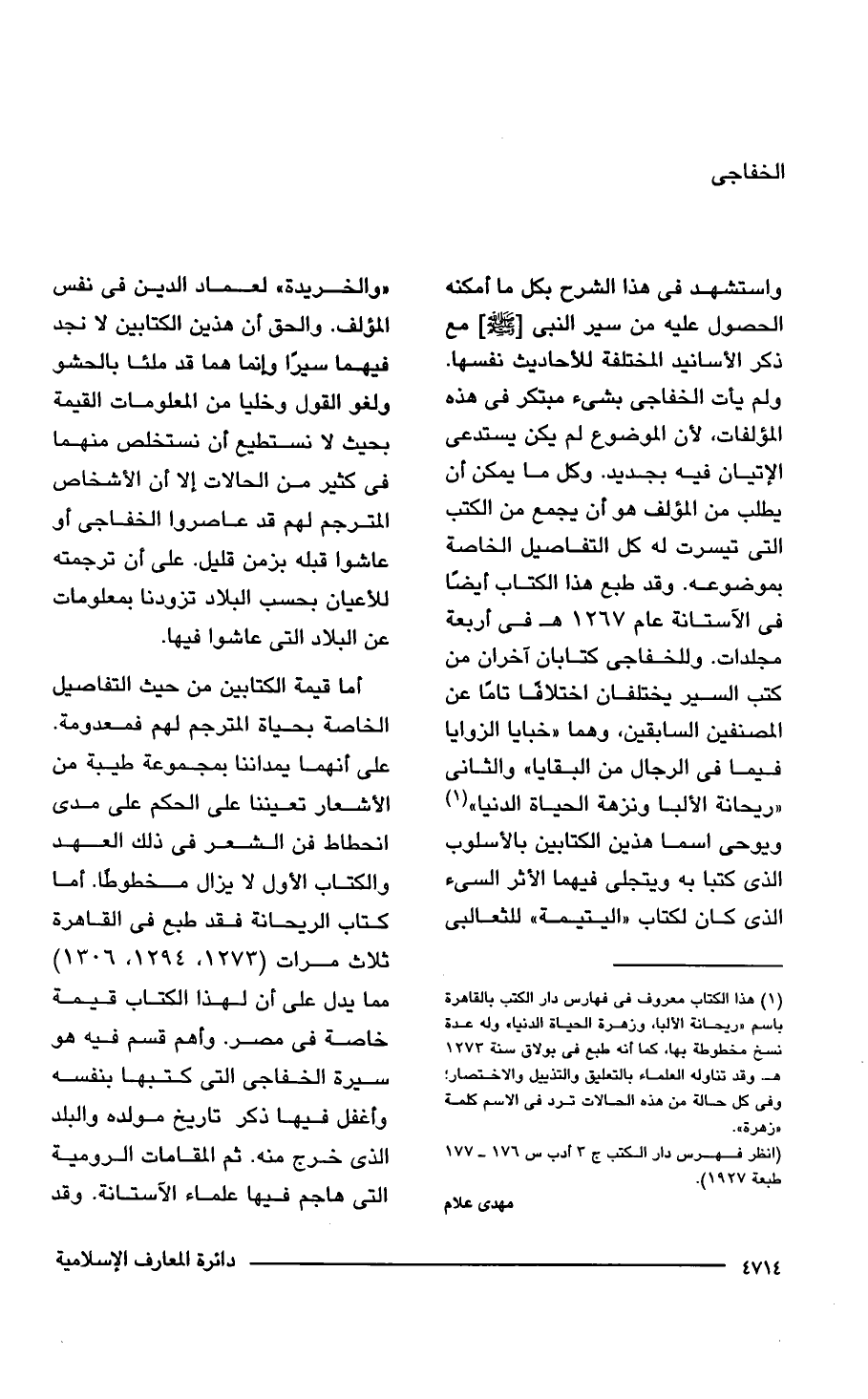 واستشهد في هذا الشرح بكل ما أمكنه الحصول عليه من سير النبي [- صلى الله عليه وسلم -] مع ذكر الأسانيد المختلفة للأحاديث نفسها. ولم يأت الخفاجى بشيء مبتكر في هذه المؤلفات، لأن الموضوع لم يكن يستدعى الإتيان فيه بجديد. وكل ما يمكن أن يطلب من المؤلف هو أن يجمع من الكتب التي تيسرت له كل التفاصيل الخاصة بموضوعه. وقد طبع هذا الكتاب أيضًا في الآستانة عام 1267 هـ في أربعة مجلدات. وللخفاجى كتابان آخران من كتب السير يختلفان اختلافا تامًا عن المصنفين السابقين، وهما "خبايا الزوايا فيما في الرجال من البقايا" والثاني "ريحانة الألبا ونزهة الحياة الدنيا" (¬1) ويوحى اسما هذين الكتابين بالأسلوب الذي كتبا به ويتجلى فيهما الأثر السئ الذي كان لكتاب "اليتيمة" للثعالبى "والخريدة" لعماد الدين في نفس المؤلف. والحق أن هذين الكتابين لا نجد فيهما سيرًا وإنما هما قد ملئا بالحشو ولغو القول وخليا من المعلومات القيمة بحيث لا نستطيع أن نستخلص منهما في كثير من الحالات إلا أن الأشخاص المترجم لهم قد عاصروا الخفاجى أو عاشوا قبله بزمن قليل. على أن ترجمته للأعيان بحسب البلاد تزودنا بمعلومات عن البلاد التي عاشوا فيها.