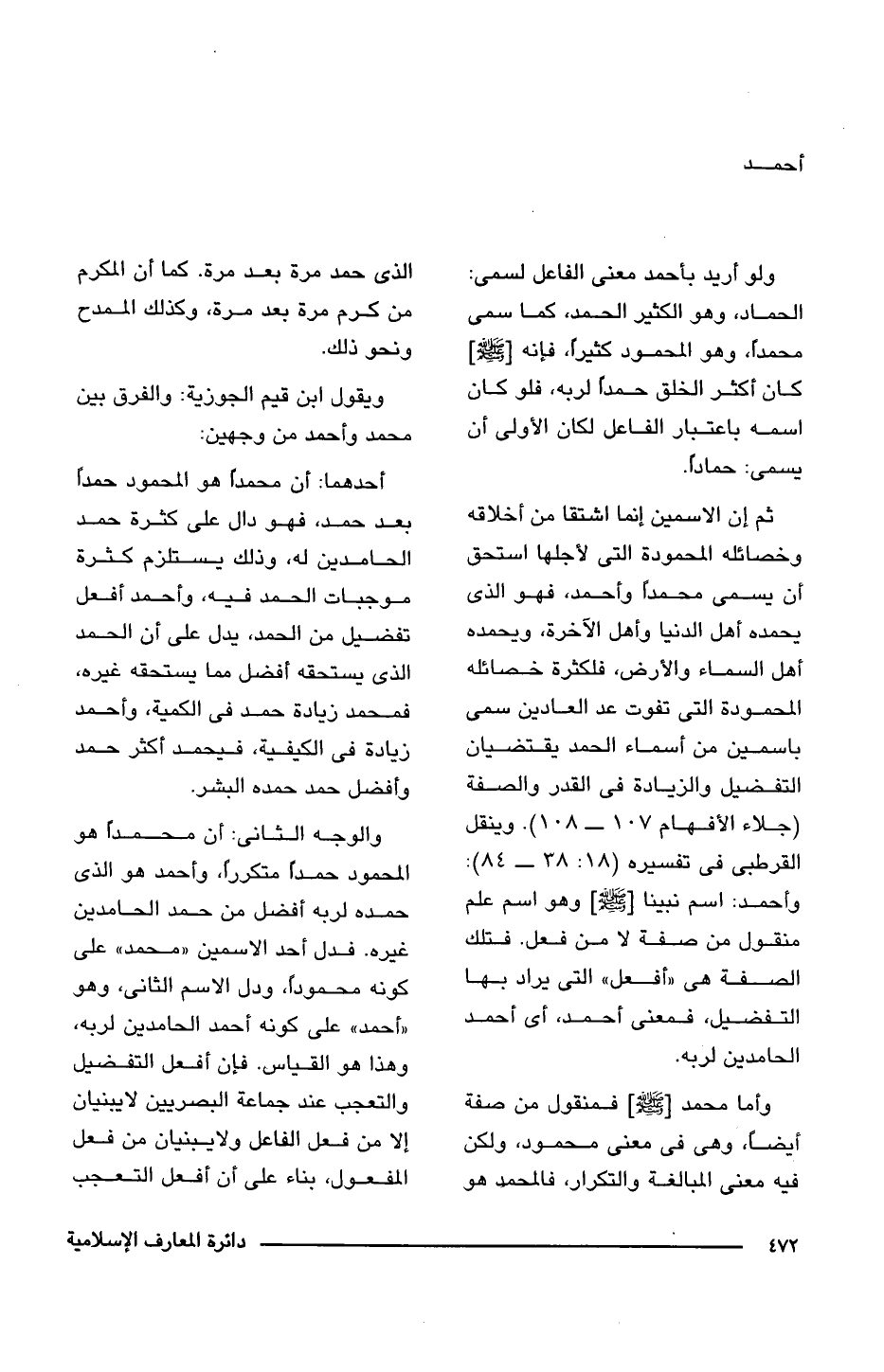أحدهما: أن محمدًا هو المحمود حمدًا بعد حمد، فهو دال على كثرة حمد الحامدين له، وذلك يستلزم كثرة موجبات الحمد فيه، وأحمد أفعل تفضيل من الحمد، يدل على أن الحمد الذى يستحقه أفضل مما يستحقه غيره، فمحمد زيادة حمد فى الكمية، وأحمد زيادة فى الكيفية، فيحمد أكثر حمد وأفضل حمد حمده البشر.