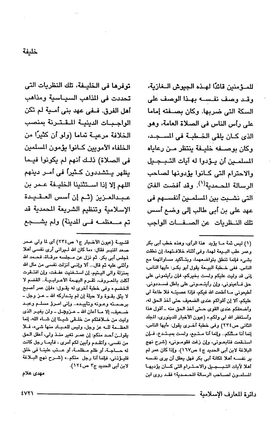 للمؤمنين قائدًا لهذه الجيوش الغازية، وقد وصف نفسه بهذا الوصف على السكة التي ضربها. وكان بصفته إماما على رأس الناس في الصلاة العامة، وهو الذي كان يلقى الخطبة في المسجد، وكان بوصفه خليفة ينتظر من رعاياه المسلمين أن يؤدوا له آيات التبجيل والاحترام التي كانوا يؤدونها لصاحب الرسالة المحمدية (¬1). وقد أفضت الفتن التي نشبت بين المسلمين أنفسهم في عهد علي بن أبي طالب إلى وضع أسس تلك النظريات عن الصفات الواجب توفرها في الخليفة، تلك النظريات التي تحددت في المذاهب السياسية ومذاهب أهل الفرق. ففي عهد بني أمية لم تكن الواجبات الدينية المقترنة بمنصب الخلافة مرعية تماما (ولو أن كثيرًا من الخلفاء الأمويين كانوا يؤمون المسلمين في الصلاة) ذلك أنهم لم يكونوا فيما يظهر يتشددون كثيرًا في أمر دينهم اللهم إلا إذا استثنينا الخليفة عمر بن عبد العزيز (ثم إن أسس العقيدة الإِسلامية وتنظيم الشريعة المحمدية قد تم معظمه في المدينة) ولم يشجع