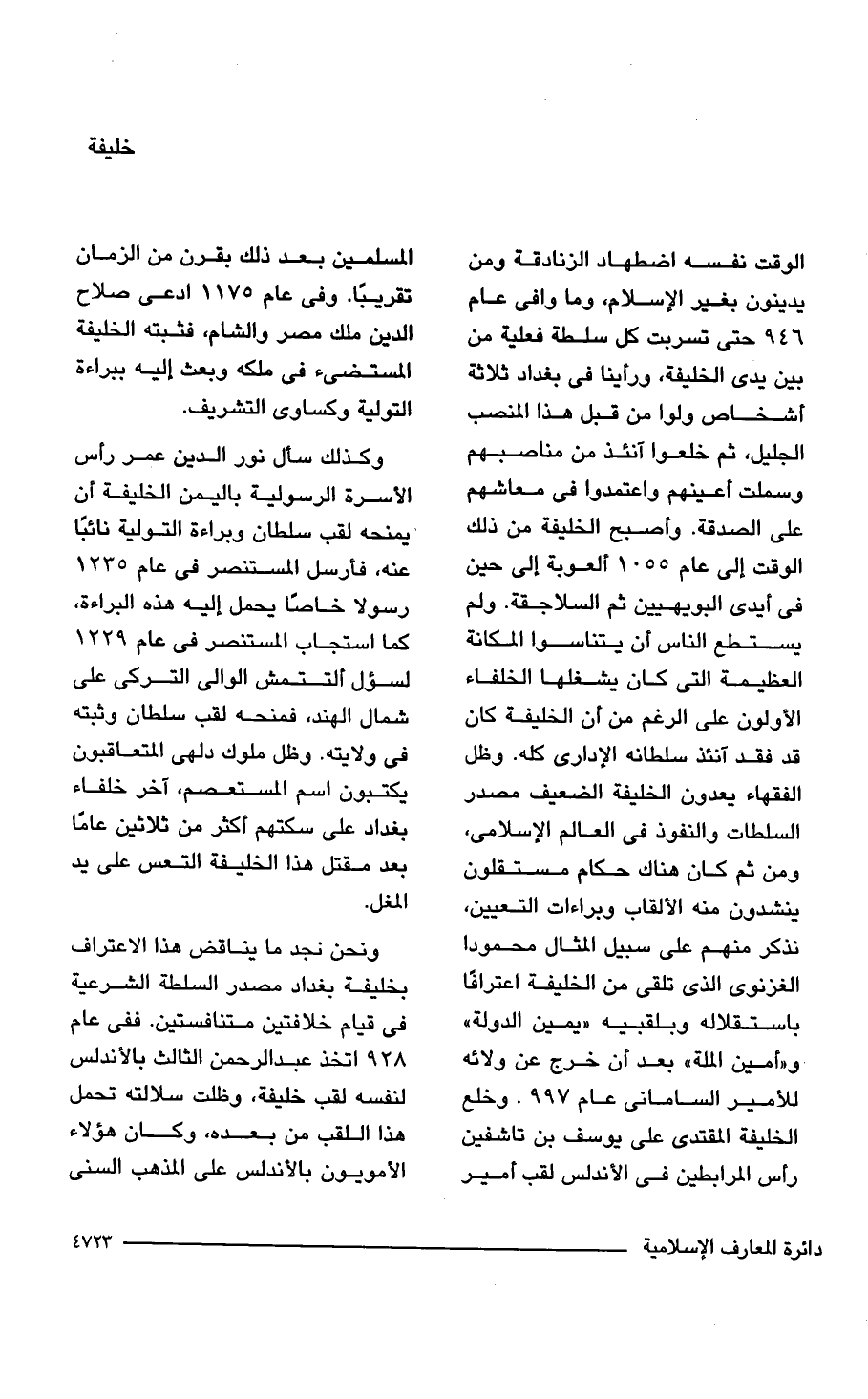 الوقت نفسه اضطهاد الزنادقة ومن يدينون بغير الإِسلام، وما وافى عام 946 حتى تسربت كل سلطة فعلية من بين يدي الخليفة، ورأينا في بغداد ثلاثة أشخاص ولوا من قبل هذا المنصب الجليل، ثم خلعوا آنئذ من مناصبهم وسملت أعينهم واعتمدوا في معاشهم على الصدقة. وأصبح الخليفة من ذلك الوقت إلى عام 1055 ألعوبة إلى حين في أيدى البويهيين ثم السلاجقة. ولم يستطع الناس أن يتناسوا المكانة العظيمة التي كان يشغلها الخلفاء الأولون على الرغم من أن الخليفة كان قد فقد آنئذ سلطانه الإدارى كله. وظل الفقهاء يعدون الخليفة الضعيف مصدر السلطات والنفوذ في العالم الإسلامي، ومن ثم كان هناك حكام مستقلون ينشدون منه الألقاب وبراءات التعيين، نذكر منهم على سبيل المثال محمودا الغزنوى الذي تلقى من الخليفة اعترافًا باستقلاله وبلقبيه "يمين الدولة" و"أمين الملة" بعد أن خرج عن ولائه للأمير السامانى عام 997. وخلع الخليفة المقتدى على يوسف بن تاشفين رأس المرابطين في الأندلس لقب أمير المسلمين بعد ذلك بقرن من الزمان تقريبًا. وفي عام 1175 ادعى صلاح الدين ملك مصر والشام، فثبته الخليفة المستضئ في ملكه وبعث إليه ببراءة التولية وكساوى التشريف.
