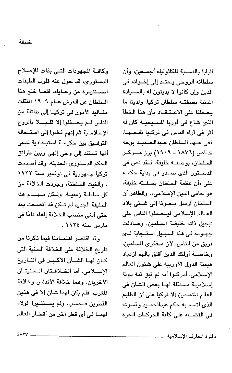 البابا بالنسبة للكاثوليك أجمعين، وأن سلطانه الروحى يمتد إلى إخوانه في الدين وإن كانوا لا يدينون له بالسيادة المدنية بصفته سلطان تركيا. ولدينا ما يحملنا على الاعتقاد بأن هذا الخطأ الذي شاع في أوربا المسيحية كان له أثر في آراء الناس في تركيا نفسها. ففي عهد السلطان عبد الحميد بوجه خاص (1876 - 1909) برز مركز السلطان، بوصفه خليفة، فقد نص في الدستور الذي صدر في بداية حكمه على "أن عظمة السلطان بصفته خليفة، هو حامى الدين الإسلامي". والظاهر أن السلطان أرسل بعوثا إلى شتى بلاد العالم الإسلامي ليحملوا الناس على تبجيل ذاته خليفة المسلمين. وصادفت جهوده في هذا السبيل استجابة لدى فريق من الناس، لأن مفكرى المسلمين، وخاصة أولئك الذين أقلق بالهم ازدياد هيمنة الدول الأوربية على شئون العالم الإسلامي، أدركوا أنه لم تبق ثمة دولة إسلامية مستقلة لها بعض الشأن في العالم المتمدين إلا تركيا على أن الطابع الذي اتسم به حكم عبد الحميد وقسوته في القضاء على كافة الحركات الحرة وكافة المجهودات التي بذلت للإصلاح الدستورى، قد حول عنه قلوب الطبقات المستنيرة من رعاياه. فلما خلع هذا السلطان عن العرش عام 1909 انتقلت مقاليد الأمور في تركيا إلى طائفة من الناس لم يحفلوا إلا قليلًا بالروح الإِسلامية ثم إنهم فطنوا إلى استحالة التوفيق بين حكومة استبدادية تدعى أنها تستند إلى وحى إلهي وبين طرائق الحكم الدستورى الحديثة. وقد أصبحت تركيا جمهورية في نوفمبر سنة 1922، وألغيت السلطنة، وجردت الخلافة من كل سلطة زمنية. ولكن مهام هذا الخليفة الجديد لم تكن قد اتضحت بعد حتى ألغى منصب الخلافة إلغاء تامًا في مارس سنة 1924.