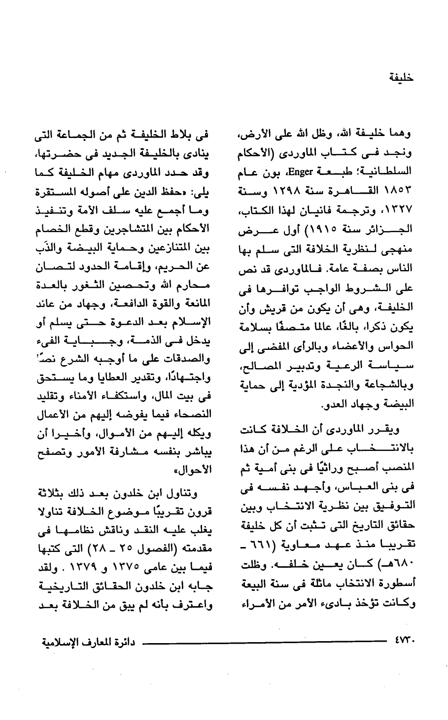 وهما خليفة الله، وظل الله على الأرض، ونجد في كتاب الماوردى (الأحكام السلطانية؛ طبعة Enger. بون عام 1853 القاهرة سنة 1298 وسنة 1327، وترجمة فانيان لهذا الكتاب، الجزائر سنة 1915) أول عرض منهجى لنظرية الخلافة التي سلم بها الناس بصفة عامة. فالماوردى قد نص على الشروط الواجب توافرها في الخليفة، وهي أن يكون من قريش وأن يكون ذكرا، بالغًا، عالمًا متصفا بسلامة الحواس والأعضاء وبالرأى المفضى إلى سياسة الرعية وتدبير المصالح، وبالشجاعة والنجدة المؤدية إلى حماية البيضة وجهاد العدو.