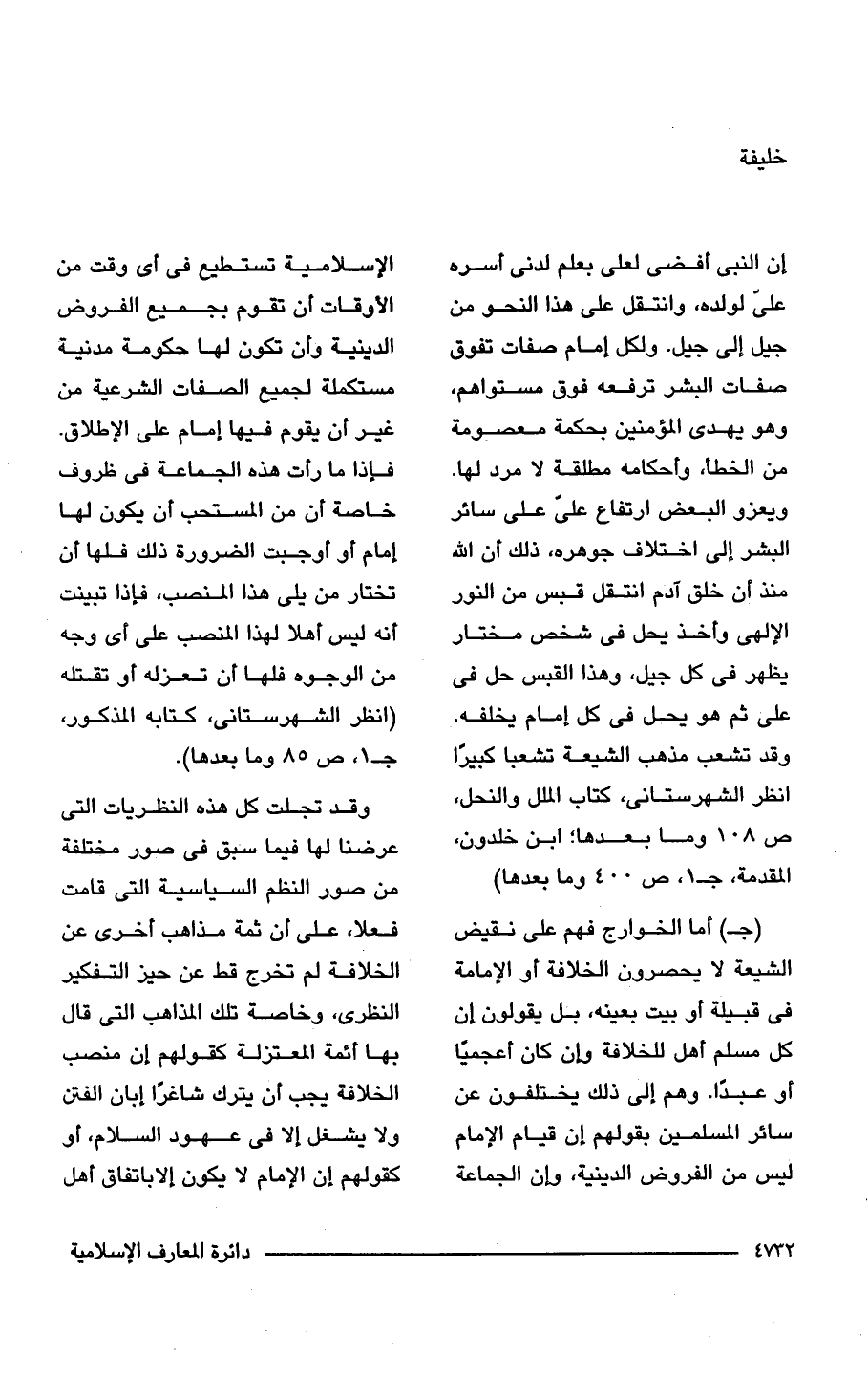 (جـ) أما الخوارج فهم على نقيض الشيعة لا يحصرون الخلافة أو الإمامة في قبيلة أو بيت بعينه، بل يقولون إن كل مسلم أهل للخلافة وإن كان أعجميًا أو عبدًا. وهم إلى ذلك يختلفون عن سائر المسلمين بقولهم إن قيام الإِمام ليس من الفروض الدينية، وإن الجماعة الإِسلامية تستطيع في أي وقت من الأوقات أن تقوم بجميع الفروض الدينية وأن تكون لها حكومة مدنية مستكملة لجميع الصفات الشرعية من غير أن يقوم فيها إمام على الإطلاق. فإذا ما رأت هذه الجماعة في ظروف خاصة أن من المستحب أن يكون لها إمام أو أوجبت الضرورة ذلك فلها أن تختار من يلي هذا المنصب، فإذا تبينت أنه ليس أهلا لهذا المنصب على أي وجه من الوجوه فلها أن تعزله أو تقتله (انظر الشهرستانى، كتابه المذكور، جـ 1، ص 85 وما بعدها).