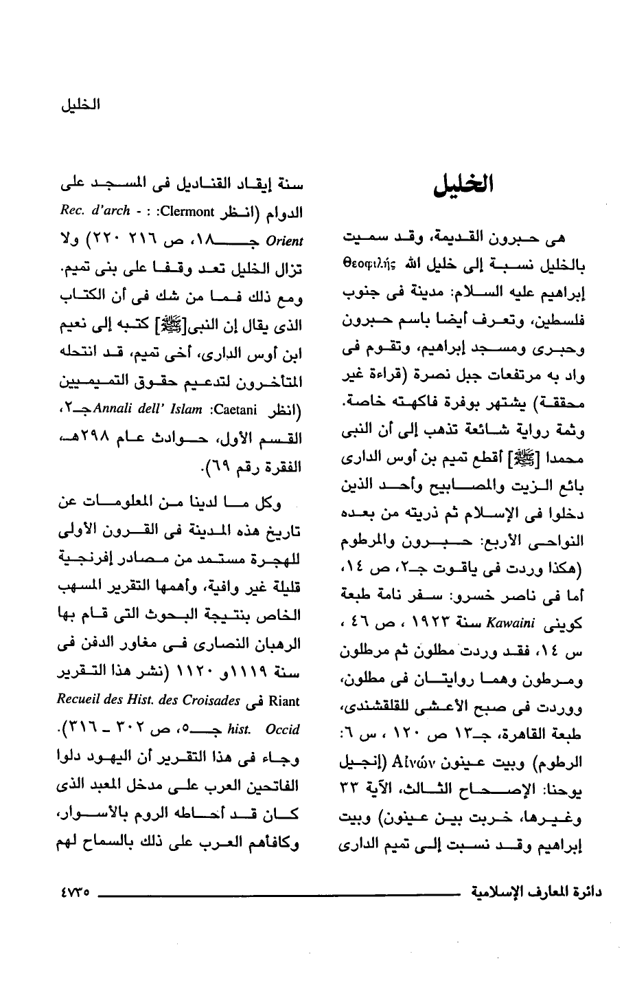 هي حبرون القديمة، وقد سميت بالخليل نسبة إلى خليل الله إبراهيم عليه السلام: مدينة في جنوب فلسطين، وتعرف أيضًا باسم حبرون وحبرى ومسجد إبراهيم، وتقوم في واد به مرتفعات جبل نصرة (قراءة غير محققة) يشتهر بوفرة فاكهته خاصة. وثمة رواية شائعة تذهب إلى أن النبي محمدا [- صلى الله عليه وسلم -] أقطع تميم بن أوس الداري بائع الزيت والمصابيح وأحد الذين دخلوا في الإِسلام ثم ذريته من بعده النواحى الأربع: حبرون والمرطوم (هكذا وردت في ياقوت جـ 2، ص 14، أما في ناصر خسرو: سفر نامة طبعة كوينى Kawaini سنة 1923 ص 46، س 14، فقد وردت مطلون ثم مرطلون ومرطون وهما روايتان في مطلون، ووردت في صبح الأعشى للقلقشندى، طبعة القاهرة، جـ 13 ص 120، س 6: الرطوم) وبيت عينون (إنجيل يوحنا: الإصحاح الثالث، الآية 33 وغيرها، خربت بين عينون) وبيت إبراهيم وقد نسبت إلى تميم الداري سنة إيقاد القناديل في المسجد على الدوام (انظر Rec. d'arch -: : Clermont Orient جـ 18، ص 216 , 220) ولا تزال الخليل تعد وقفا على بني تميم. ومع ذلك فما من شك في أن الكتاب الذي يقال إن النبي [- صلى الله عليه وسلم -] كتبه إلى نعيم ابن أوس الداري، أخي تميم، قد انتحله المتأخرون لتدعيم حقوق التميميين (انظر Annali dell' Islam: Caetani جـ 2، القسم الأول، حوادث عام 298 هـ, الفقرة رقم 69).
