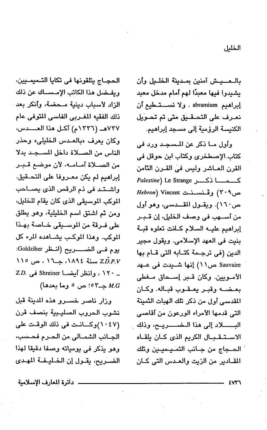 وأول ما ذكر عن المسجد ورد في كتاب الإصطخرى وكتاب ابن حوقل في القرن العاشر وليس في القرن الثامن كما ذكر Palestine) Le Strange ص 309) وفنسنت Hebron) Vincent ص 160). ويقول المقدسي، وهو أول من أسهب في وصف الخليل، إن قبر إبراهيم عليه السلام كانت تعلوه قبة بنيت في العهد الإسلامي. ويقول مجير الدين (في ترجمة كتابه التي قام بها Sauvaire ص 11) إنها شيدت في عهد الأمويين. وكان قبر إسحاق مغطى بعضه وقبر يعقوب قباله. وكان المقدسي أول من ذكر تلك الهبات الثمينة التي قدمها الأمراء الورعون من أقاصى البلاد إلى هذا الضريح، وذلك الاستقبال الكريم الذي كان يلقاه الحجاج من جانب التميميين وتلك المقادير من الزيت والعدس التي كان الحجاج يتلقونها في تكايا التميميين، ويفضل هذا الكاتب الإمساك عن ذلك الزاد لأسباب دينية محضة، وأنكر بعد ذلك الفقيه المغربي الفاسي المتوفى عام 737 هـ (1336 م) أكل هذا العدس، وكان يعرف "بالعدس الخليلى" وحذر الناس من الصلاة داخل المسجد بدلا من الصلاة أمامه، لأن موضع قبر إبراهيم لم يكن معروفا على التحقيق. واشتد في ذم الرقص الذي يصاحب الموكب الموسيقى الذي كان يقام للخليل، ومن ثم اشتق اسم الخليلية، وهو يطلق على فرقة من الموسيقى خاصة بهذا الموكب. وهذا الموكب يشاهده المرء كل يوم في الضريح (انظر Goldziher: ZD.P.V سنة 1894 جـ 16، ص 115 - 120، وانظر أيضا Shreiner في Z.D. M.G جـ 53؛ ص 5 وما بعدها).