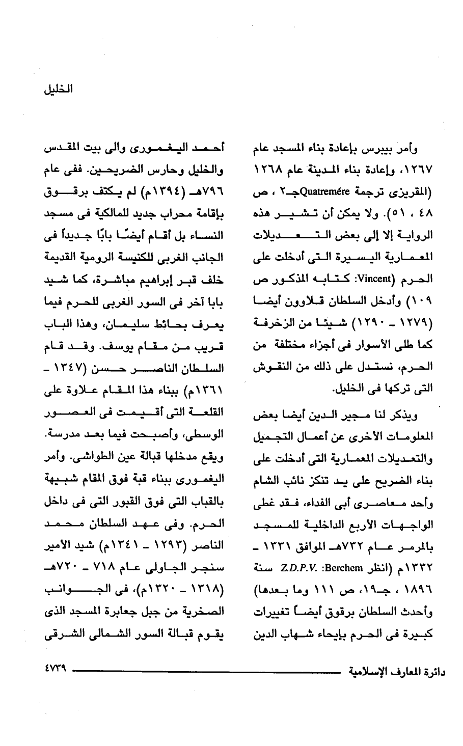 وأمر بيبرس به. عادة بناء المسجد عام 1267، وإعادة بناء المدينة عام 1268 (المقريزى ترجمة Quatremere جـ 2، ص 48، 51). ولا يمكن أن تشير هذه الرواية إلا إلى بعض التعديلات المعمارية اليسيرة التي أدخلت على الحرم (Vincent: كتابه المذكور ص 109) وأدخل السلطان قلاوون أيضا (1279 - 1290) شيئًا من الزخرفة كما طلى الأسوار في أجزاء مختلفة من الحرم، نستدل على ذلك من النقوش التي تركها في الخليل.