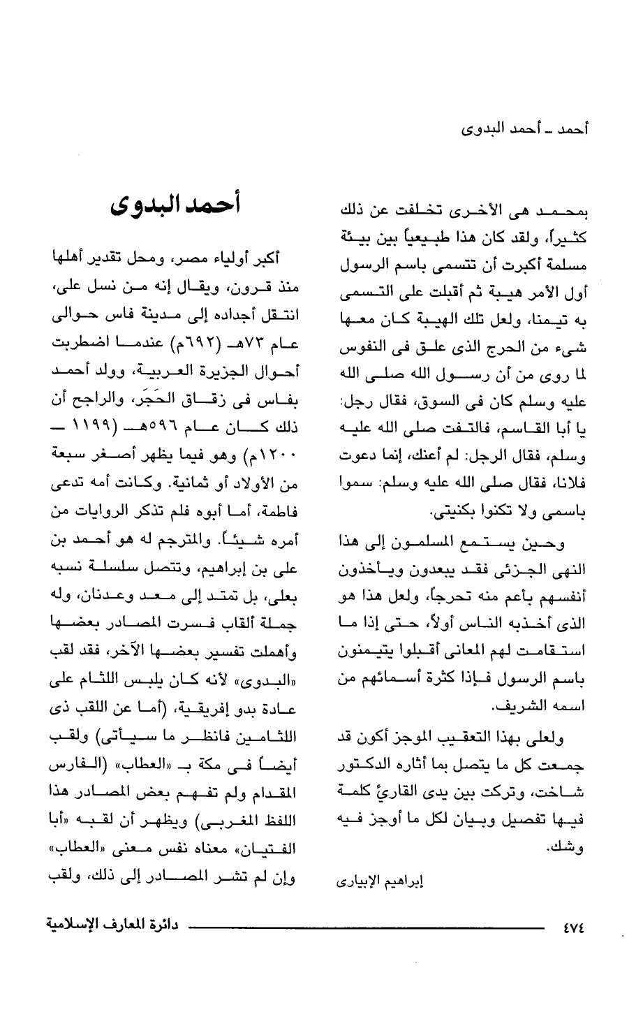 أكبر أولياء مصر، ومحل تقدير أهلها منذ قرون، ويقال إنه من نسل على، انتقل أجداده إلى مدينة فاس حوالى عام 73 هـ (692 م) عندما اضطربت أحوال الجزيرة العربية، وولد أحمد بفاس فى زقاق الحَجَر, والراجح أن ذلك كان عام 596 هـ (1199 - 1200 م) وهو فيما يظهر أصغر سبعة من الأولاد أو ثمانية. وكانت أمه تدعى فاطمة، أما أبوه فلم تذكر الروايات من أمره شيئًا. والمترجم له هو أحمد بن علي بن إبراهيم، وتتصل سلسلة نسبه بعلى، بل تمتد إلى معد وعدنان، وله جملة ألقاب فسرت المصادر بعضها وأهملت تفسير بعضها الآخر, فقد لقب "البدوى" لأنه كان يلبس اللثام على عادة بدو إفريقية، (أما عن اللقب ذى اللثامين فانظر ما سيأتى) ولقب أيضًا فى مكة بـ "العطاب" (الفارس المقدام ولم تفهم بعض المصادر هذا اللفظ المغربى) ويظهر أن لقبه "أبا الفتيان" معناه نفس معنى "العطاب" وإن لم تشر المصادر إلى ذلك، ولقب