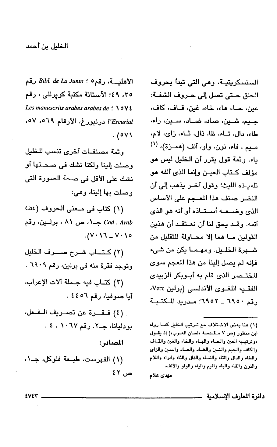 السنسكريتية، وهي التي تبدأ بحروف الحلق حتى تصل إلى حروف الشفة: عين، حاء هاء، خاء، غين، قاف، كاف، جيم، شين، صاد، ضاد، سين، راء، طاء، دال، تاء، ظا، ذال، ثاء، زاى، لام، ميم، فاء، نون، واو، ألف (همزة)، (¬1) ياء. وثمة قول يقرر أن الخليل ليس هو مؤلف كتاب العين وإنما الذي ألفه هو تلميذه الليث؛ وقول آخر يذهب إلى أن النضر صنف هذا المعجم على الأساس الذي وضعه أستاذه أو أنه هو الذي أتمه. وقد يحق لنا أن نعتقد أن هذين القولين ما هما إلا محاولة للتقليل من شهرة الخليل. ومهما يكن من شيء فإنه لم يصل إلينا من هذا المعجم سوى المختصر الذي قام به أبو بكر الزبيدى الفقيه اللغوى الأندلسي (برلين Verz، رقم 6950 - 6952؛ مدريد المكتبة الأهلية، رقم 5؛ Bib! . de La Junta رقم 35، 49؛ الآستانة مكتبة كوبرللى، رقم 1574؛ Les manuscrits arabes de L'Escurial درنبورغ, الأرقام 569, 57, 571).