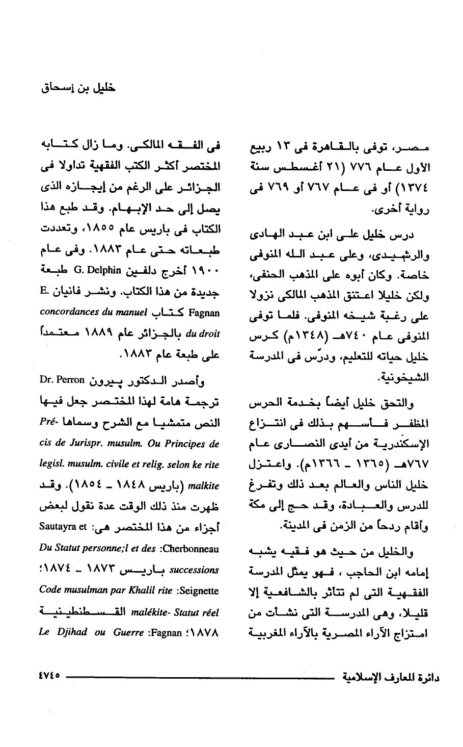 واصدر الدكتور بيرون Dr. Perron ترجمة هامة لهذا المختصر جعل فيها النص متمشيا مع الشرح وسماها Precis de Jurispr . musulm Ou Princines de legisl musulm. civile et relig. selon ke rite . malkite) باريس 1848 - 1854). وقد ظهرت منذ ذلك الوقت عدة نقول لبعض أجزاء من هذا المختصر هي: Sautayra et Du Statut personnel et des: Cherbonneau successions باريس 1873 - 1874؛ Code musulman par Khalil rite: Seignette malekite- Statut reel القسطنطينية 1878؛ Le Djihad ou Guerre: Fagnan