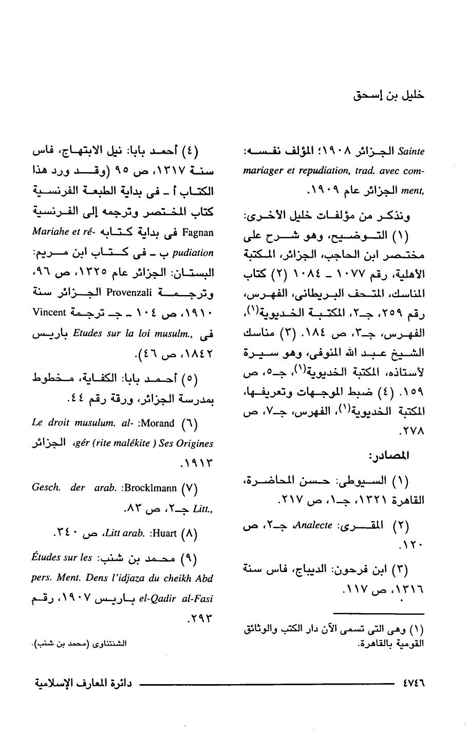 (4) أحمد بابا: نيل الابتهاج، فاس سنة 1317 , ص 95 (وقد ورد هذا الكتاب أ - في بداية الطبعة الفرنسية كتاب المختصر وترجمه إلى الفرنسية Fagnan في بداية كتابه Mariahe et repudiation ب - في كتاب ابن مريم: البستان: الجزائر عام 1325, ص 96، وترجمة Provenzali الجزائر سنة 1910, ص 104 - جـ ترجمة Vincent في Etudes sur la loi musulm باريس 1842، ص 46).