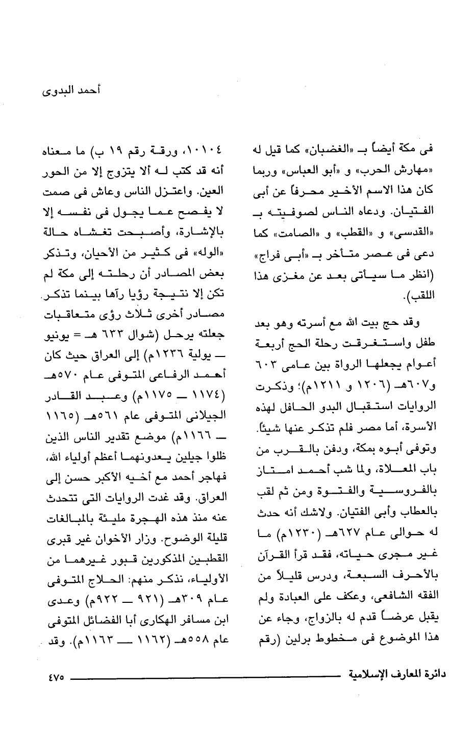 وقد حج بيت الله مع أسرته وهو بعد طفل واستغرقت رحلة الحج أربعة أعوام يجعلها الرواة بين عامى 603 و 607 هـ (1206 و 1211 م)؛ وذكرت الروايات استقبال البدو الحافل لهذه الأسرة، أما مصر فلم تذكر عنها شيئًا. وتوفى أبوه بمكة، ودفن بالقرب من باب المعلاة، ولما شب أحمد امتاز بالفروسية والفتوة ومن ثم لقب بالعطاب وأبى الفتيان. ولاشك أنه حدث له حوالى عام 627 هـ (1230 م) ما غير مجرى حياته، فقد قرأ القرآن بالأحرف السبعة، ودرس قليلًا من الفقه الشافعي، وعكف على العبادة ولم يقبل عرضًا قدم له بالزواج، وجاء عن هذا الموضوع فى مخطوط برلين (رقم 10104، ورقة رقم 19 ب) ما معناه أنه قد كتب له ألا يتزوج إلا من الحور العين. واعتزل الناس وعاش فى صمت لا يفصح عما يجول فى نفسه إلا بالإشارة، وأصبحت تغشاه حالة "الوله" فى كثير من الأحيان، وتذكر بعض المصادر أن رحلته إلى مكة لم تكن إلا نتيجة رؤيا رآها بينما تذكر، مصادر أخرى ثلاث رؤى متعاقبات جعلته يرحل (شوال 633 هـ - يونيو - يولية 1236 م) إلى العراق حيث كان أحمد الرفاعى المتوفى عام 570 هـ (1174 - 1175 م) وعبد القادر الجيلانى المتوفى عام 561 هـ (1165 - 1166 م) موضع تقدير الناس الذين ظلوا جيلين يعدونهما أعظم أولياء الله، فهاجر أحمد مع أخيه الأكبر حسن إلى العراق. وقد غدت الروايات التى تتحدث عنه منذ هذه الهجرة مليئة بالمبالغات قليلة الوضوح. وزار الأخوان غير قبرى القطبين المذكورين قبور غيرهما من الأولياء، نذكر منهم: الحلاج المتوفى عام 309 هـ (921 - 922 م) وعدى ابن مسافر الهكارى أبا الفضائل المتوفى عام 558 هـ (1163 - 1163 م). وقد