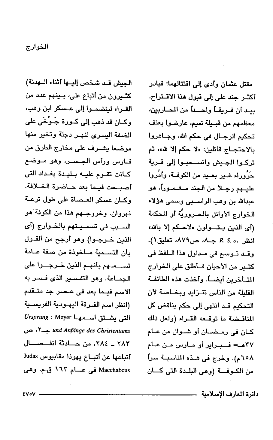 مقتل عثمان وأدى إلى اقتتالهما؛ فبادر أكثر جند علي إلى قبول هذا الاقتراح. بيد أن فريقا واحدًا من المحاربين، معظمهم من قبيلة تميم، عارضوا بعنف تحكيم الرجال في حكم الله، وجاهروا بالاحتجاج قائلين: "لا حكم إلا لله"، ثم تركوا الجيش وانسحبوا إلى قرية حَرُوراء غير بعيد من الكوفة، وأمروا عليهم رجلًا من الجند مغمورًا، هو عبد الله بن وهب الراسبى وسمى هؤلاء الخوارج الأوائل بالحروريَّة أو المحكمة (أي الذين يقولون "لا حكم إلا بالله" انظر R. S. O. جـ 8، ص 879 , تعليق 1). وقد توسع في مدلول هذا اللفظ في كثير من الأحيان فأطلق على الخوارج المتأخرين أيضًا. وأخذت هذه الطائفة القليلة من الناس تتزايد وبخاصة لأن التحكيم قد انتهى إلى حكم يناقض كل المناقضة ما توقعه القراء (ولعل ذلك كان في رمضان أو شوال من عام 37 هـ = فبراير أو مارس من عام 658 م). وخرج في هذه المناسبة سرًا من الكوفة (وهي البلدة التي كان الجيش قد شخص إليها أثناء الهدنة كثيرون من أتباع علي، بينهم عدد من القراء لينضموا إلى عسكر ابن وهب، وكان قد ذهب إلى كورة جَوْخَى على الضفة اليسرى لنهر دجلة وتخير منها موضعا يشرف على مخارج الطرق من فارس ورأس الجسر، وهو موضع كانت تقوم عليه بليدة بغداد التي أصبحت فيما بعد حاضرة الخلافة. وكان عسكر العصاة على طول ترعة نهروان. وخروجهم هذا من الكوفة هو السبب في تسميتهم بالخوارج (أي الذين خرجوا) وهو أرجح من القول بأن التسمية مأخوذة من صفة عامة تسمهم بأنهم الذين خرجوا على الجماعة، وهو التفسير الذي فسر به الاسم فيما بعد في عصر جد متقدم (انظر اسم الفرقة اليهودية الفريسية التي يشتق اسمها und Ursprung: Meyer Anfange des Christentums جـ 2، ص 283 - 284 من حادثة انفصال أتباعها عن أتباع يهوذا مقابيوس Judas Macchabeus في عام 163 ق. م. وهي