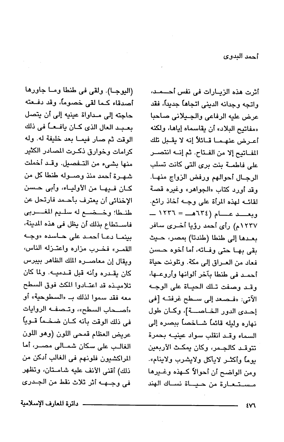 نهاره وليله قائمًا شاخصًا ببصره إلى السماء وقد انقلب سواد عينيه بحمرة تتوقد كالجمر، وكان يمكث الأربعين يومًا وأكثر لا يأكل ولا يشرب ولا ينام". ومن الواضح أن أحوالًا كهذه وغيرها مستعارة من حياة نساك الهند (اليوجا). ولقى فى طنطا وما جاورها أصدقاء كما لقى خصومًا، وقد دفعته حاجته إلى مداواة عينيه إلى أن يتصل بعبد العال الذى كان يافعًا فى ذلك الوقت ثم صار فيما بعد خليفة له. وله كرامات وخوارق ذكرت المصادر الكثير منها بشيء من التفصيل. وقد أخملت شهرة أحمد منذ وصوله طنطا كل من كان فيها من الأولياء، وأبى حسن الإخنائى أن يعترف بأحمد فارتحل عن طنطا؛ وخضع له سليم المغربى فاستطاع بذلك أن يظل فى هذه المدينة، بينما دعا أحمد على حاسده "وجه القمر" فخرب مزاره واعتزله الناس, ويقال إن معاصره الملك الظاهر بيبرس كان يقدره وأنه قبل قدميه. ولما كان تلاميذه قد اعتادوا المكث فوق السطح معه فقد سموا لذلك بـ "السطوحية" أو"أصحاب السطح"، وتصفه الروايات فى ذلك الوقت بأنه كان ضخمًا قويًا عريض العظام قمحى اللون (وهو اللون الغالب على سكان شمالى مصر, أما المراكشيون فلونهم فى الغالب أدكن من ذلك) أقنى الأنف عليه شامتان، وتظهر فى وجهه أثر ثلاث نقط من الجدرى