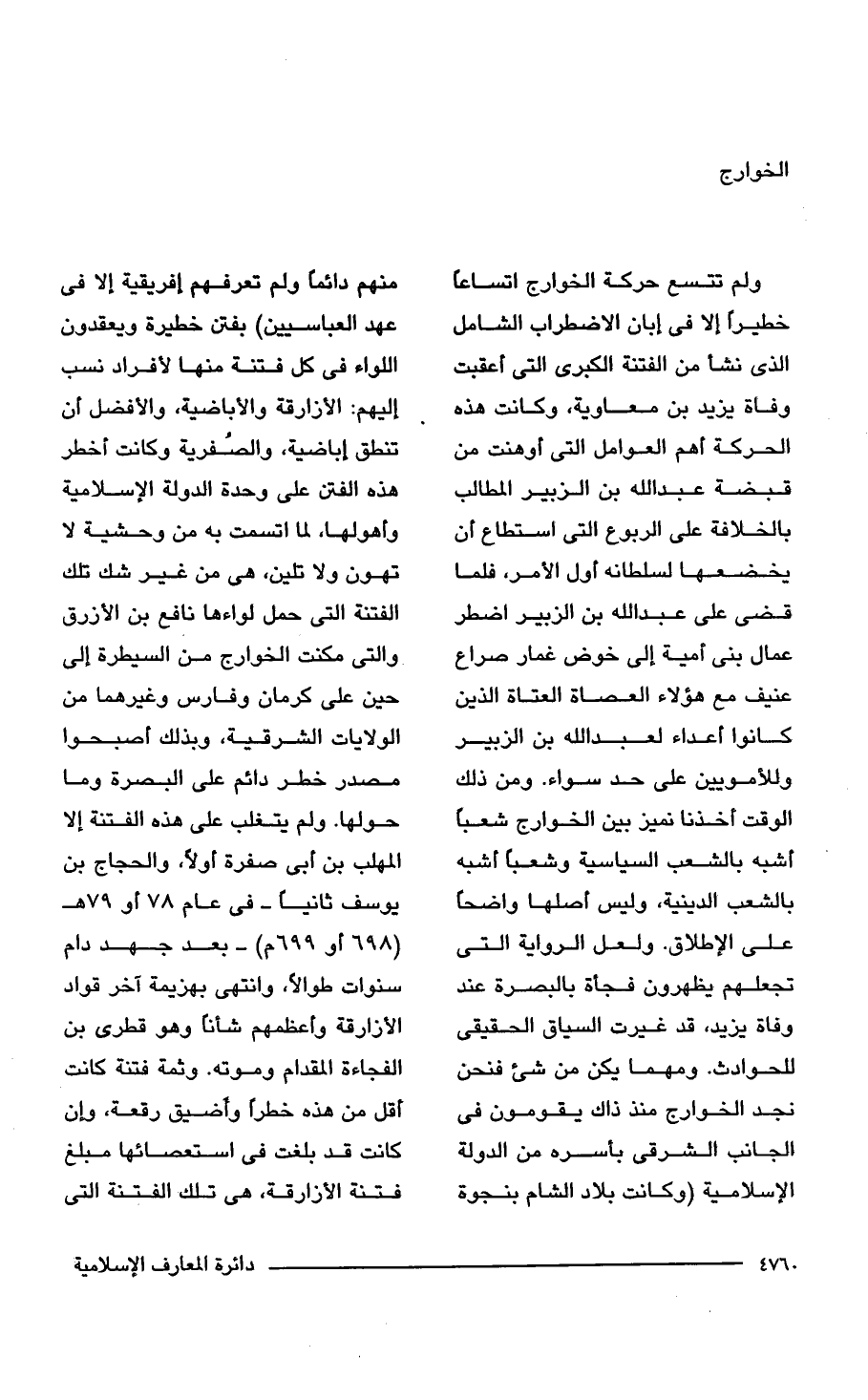 ولم تتسع حركة الخوارج اتساعًا خطيرًا إلا في إبان الاضطراب الشامل الذي نشأ من الفتنة الكبرى التي أعقبت وفاة يزيد بن معاوية، وكانت هذه الحركة أهم العوامل التي أوهنت من قبضة عبد الله بن الزبير المطالب بالخلافة على الربوع التي استطاع أن يخضعها لسلطانه أول الأمر، فلما قضى على عبد الله بن الزبير اضطر عمال بني أمية إلى خوض غمار صراع عنيف مع هؤلاء العصاة العتاة الذين كانوا أعداء لعبد الله بن الزبير وللأمويين على حد سواء. ومن ذلك الوقت أخذنا تميز بين الخوارج شعبا أشبه بالشعب السياسية وشعبا أشبه بالشعب الدينية، وليس أصلها واضحا على الإطلاق. ولعل الرواية التي تجعلهم يظهرون فجأة بالبصرة عند وفاة يزيد، قد غيرت السياق الحقيقي للحوادث. ومهما يكن من شيء فنحن نجد الخوارج منذ ذاك يقومون في الجانب الشرقى بأسره من الدولة الإسلامية (وكانت بلاد الشام بنجوة منهم دائما ولم تعرفهم إفريقية إلا في عهد العباسيين) بفتن خطيرة ويعقدون اللواء في كل فتنة منها لأفراد نسب إليهم: الأزارقة والأباضية، والأفضل أن تنطق إباضية، والصُفرية وكانت أخطر هذه الفتن على وحدة الدولة الإِسلامية وأهولها, لما اتسمت به من وحشية لا تهون ولا تلين، هي من غير شك تلك الفتنة التي حمل لواءها نافع بن الأزرق والتي مكنت الخوارج من السيطرة إلى حين على كرمان وفارس وغيرهما من الولايات الشرقية، وبذلك أصبحوا مصدر خطر دائم على البصرة وما حولها. ولم يتغلب على هذه الفتنة إلا المهلب بن أبي صفرة أولًا، والحجاج بن يوسف ثانيا -في عام 78 أو 79 هـ (698 أو 699 م) - بعد جهد دام سنوات طوالًا، وانتهى بهزيمة آخر قواد الأزارقة وأعظمهم شأنا وهو قطرى بن الفجاءة المقدام وموته. وثمة فتنة كانت أقل من هذه خطرًا وأضيق رقعة، وإن كانت قد بلغت في استعصائها مبلغ فتنة الأزارقة، هي تلك الفتنة التي